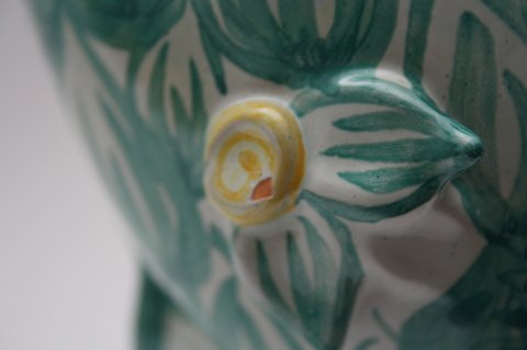 Titania vase i grøn/gul glaseret keramik. Dessinnr. V20. Signeret monogram Danmark 74. H. 27 cm. Afslag på det ene øre se foto, ellers i fin stand.
