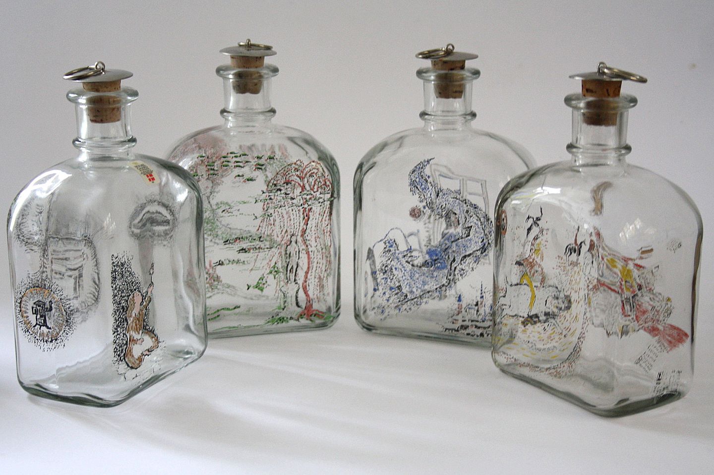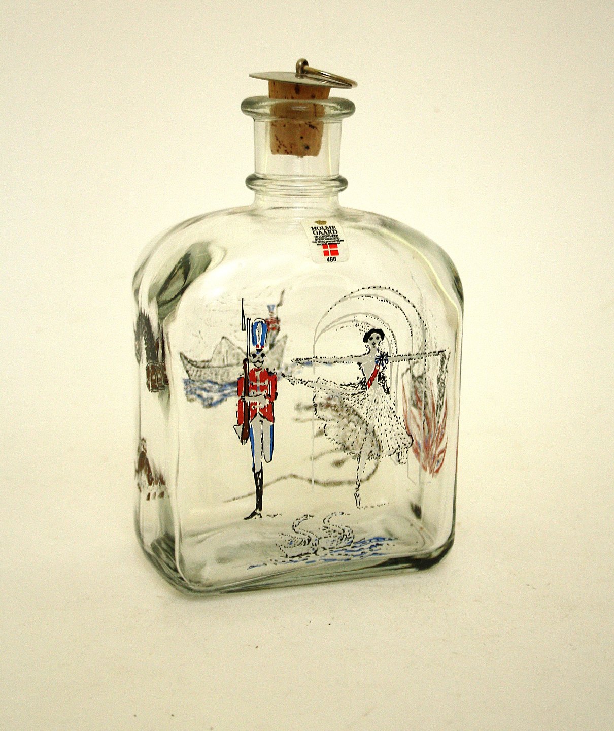 Holmegaard, karafler med motiver fra H.C. Andersens eventyr. Dekoreret af Lars Bo. Højde 18 cm. Pris: 250 kr. pr. stk.