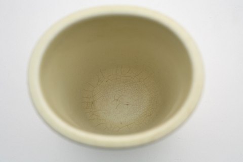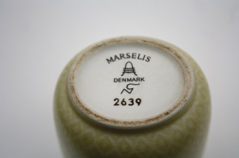 Aluminia, Marselis kunstfajance, gul vase designet af Nils Thorsson i 1952. Dek.nr. 2639. Højde 10,5 cm. Øverste diameter 9 cm. I. sortering. Krakeleret i bund indvendig, se ekstra foto. Pris: SOLGT