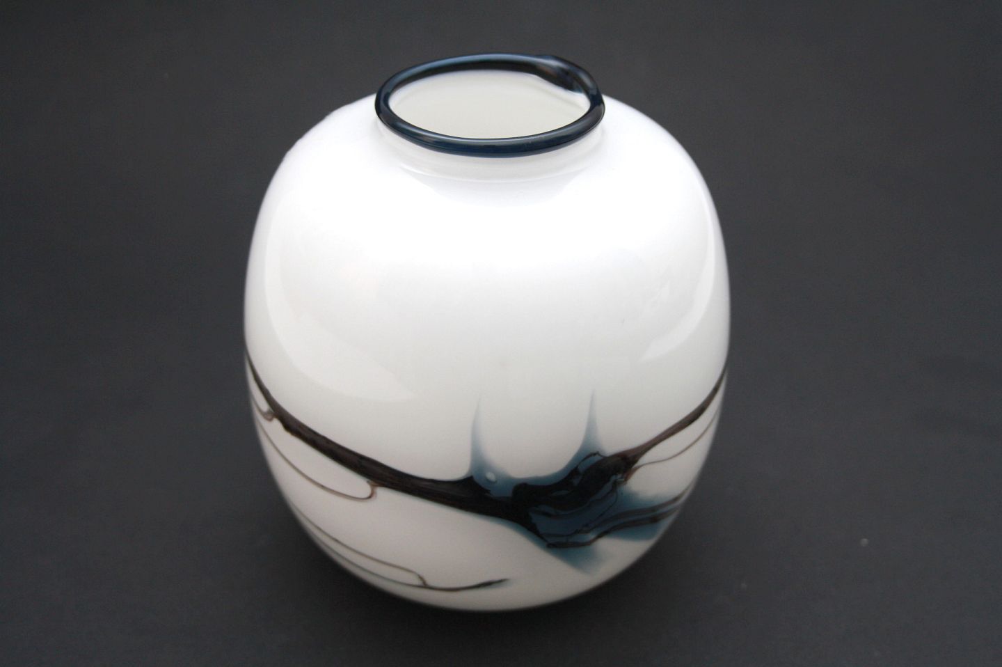 Holmegaard, Atlantis serien designet af Michael Bang i 1980. Farveklatter og tråde i blåt glas på opal hvidt og klart glas. Blæst i tre lag glas. Vase højde 10,5 cm. Diameter 9,5 cm. Pris: SOLGT