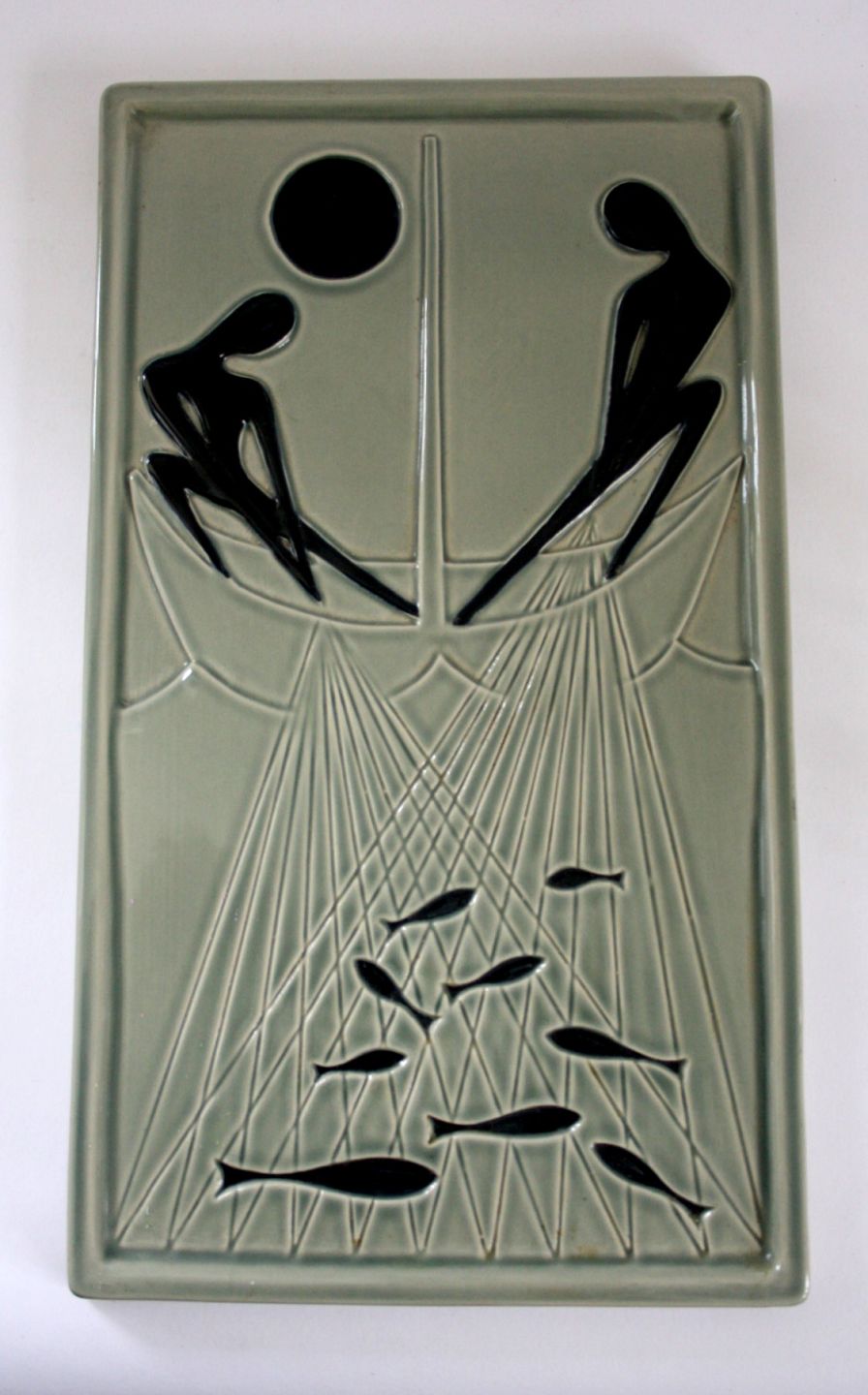 Søholm, Relief "Fiskerne" fra serien "Du og jeg" designet af Holm Sørensen i 1958-1959. Meget velholdt, ingen afslag. Bredde 21,5 cm. Længde 38 cm. Højde 2,5 cm. Pris: