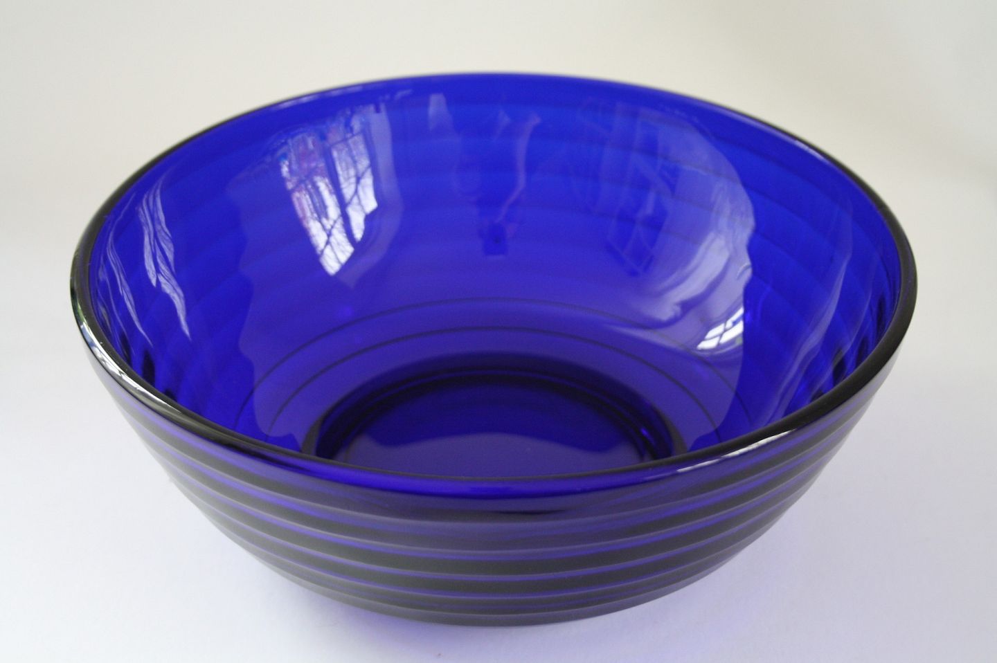 Holmegaard, Broksø presset glas 1938-1941, designet af Jacob E Bang. Mørkeblå stor skål, der er fabrikationsfejl i form af ridser i kanten. Diameter 22 cm. Højde 8,5 cm. Pris: SOLGT