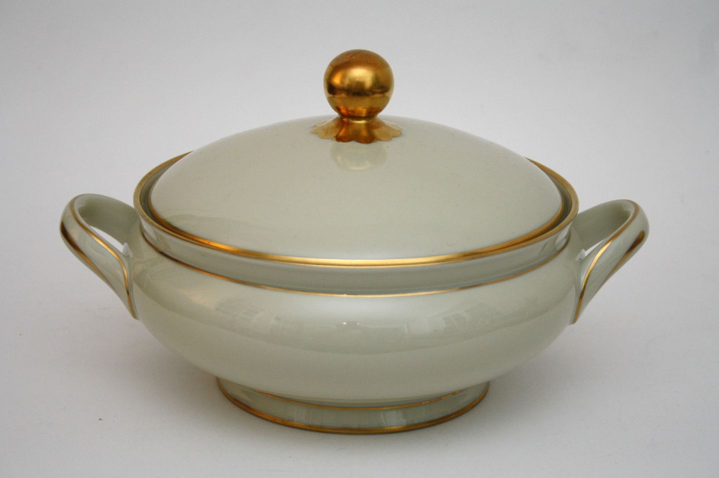 Kjøbenhavns Porcellains Maleri, Vallø cremefarvet glasur med guldbelægning. Stellet er fremstillet fra midten af 1930'erne. Pæn