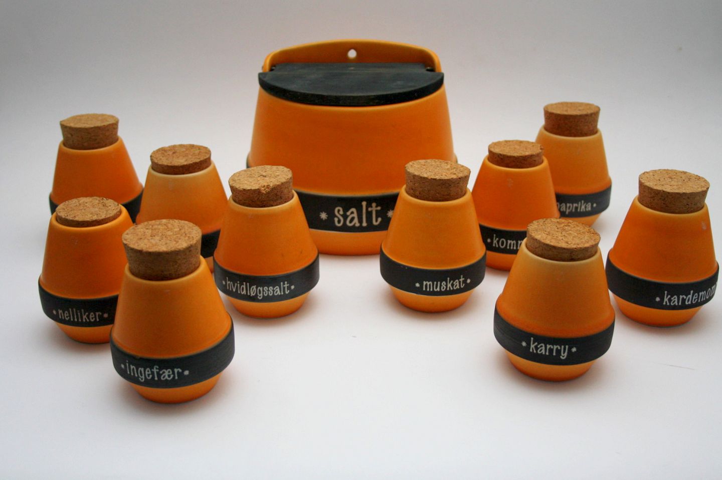 Krydderikrukker med korkprop. Højde 9 cm. Pris: 65 kr. stk.
