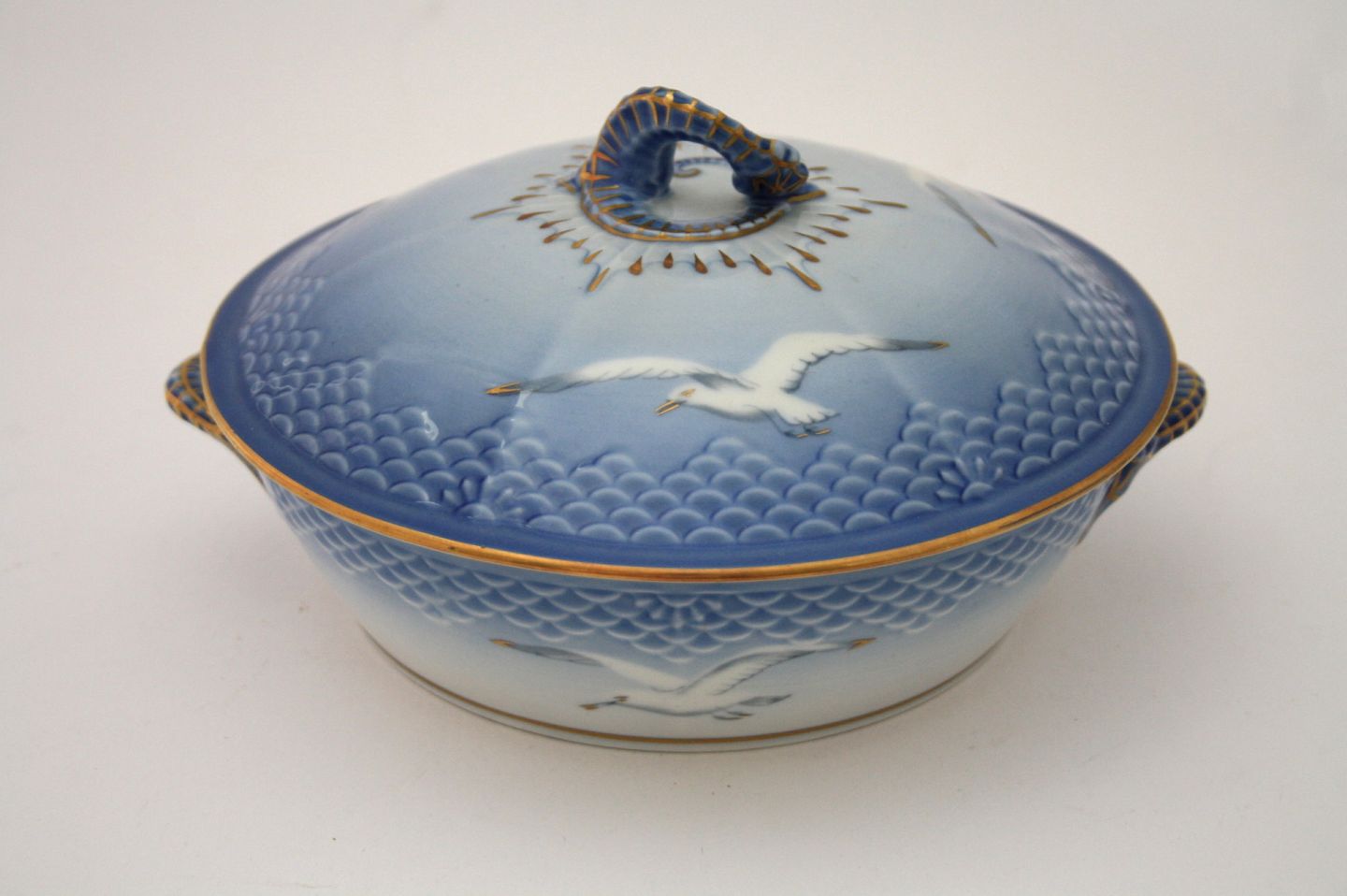 Bing & Grøndahl, Måge med guld, Terrin med låg. Dek.nr. 511 og 5A. I. og II. sortering. Højde 10 cm. Diameter 17,5 cm. SOLGT