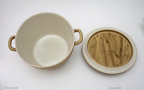 Stor gryde med låg. Højde 16 cm. Øverste diameter 19 cm. Pris: 400 kr. stk. Lager: 1