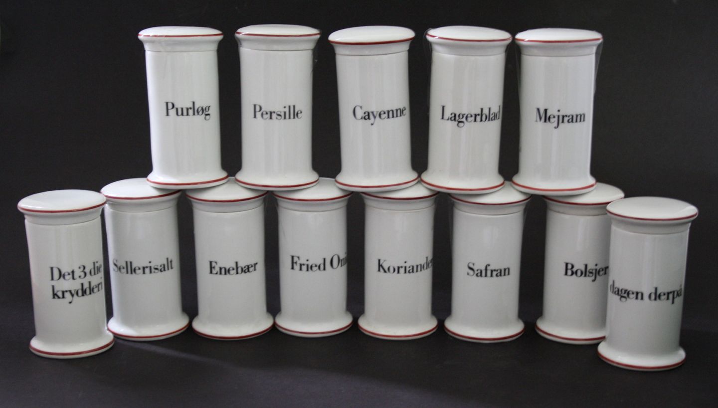 Bing & Grøndahl, Apoteker Serien Krydderikrukker. Nr. 497. Højde 11,5 cm. Fin stand. Disse er lidt sjældnere. Pris: 175 kr. pr. stk.