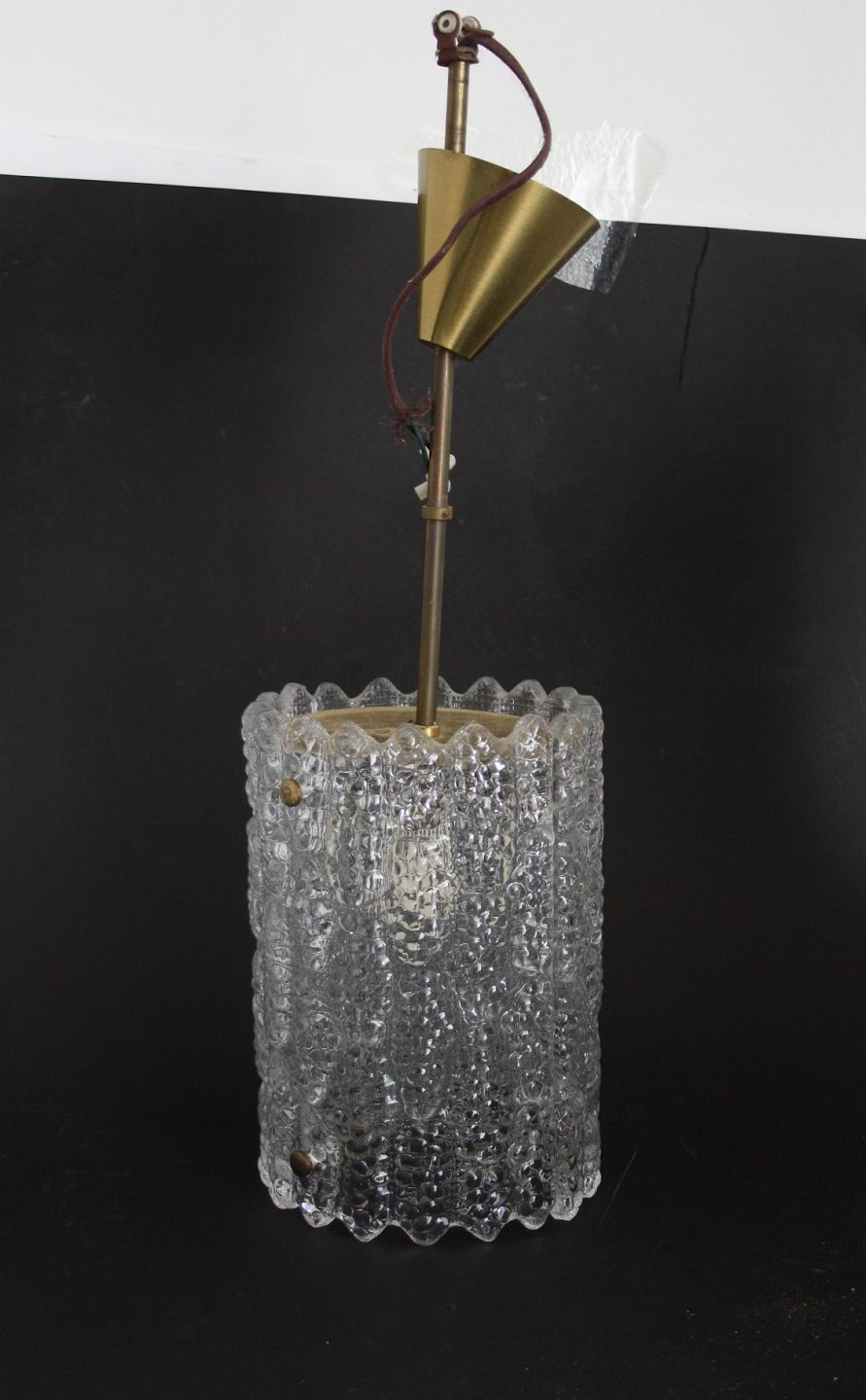 Orrefors loftlampe. Glasset er i 2 dele og har en højde på 25 cm. Højde incl. messing ophæng 58 cm. Pris: SOLGT