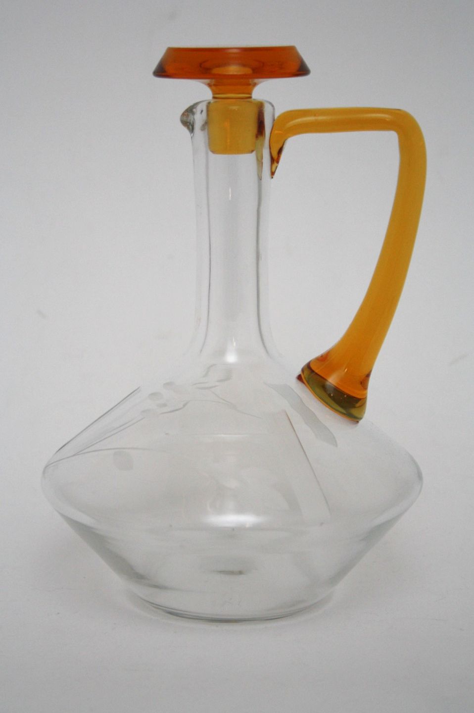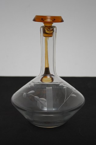 Likørkaraffel med ravfarvet prop og hank antagelig svensk. Højde 20,5 cm. Midterste diameter 14 cm. Flot stand. Pris: 275 kr.