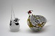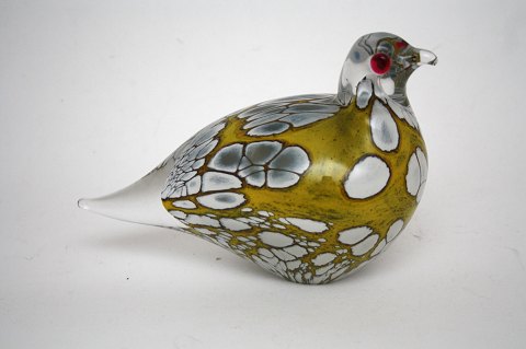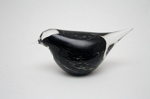 Midten. Sort fugl med klar glas på hoved, næb og hale. Højde 7 cm. Længde 16 cm. Pris: SOLGT
