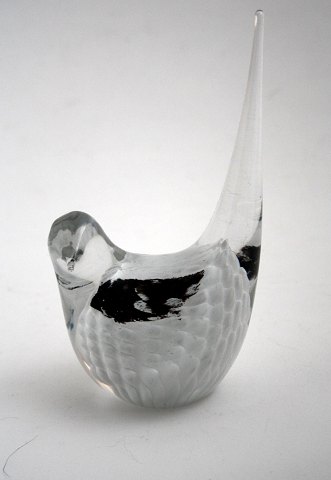 Til venstre. Fugl med opretstående hale. Klar glas med hvidt og sort indvendig. Signeret FM Ronneby, Sweden. Højde 17 cm. Længde 10 cm. Pris: 600 kr.
