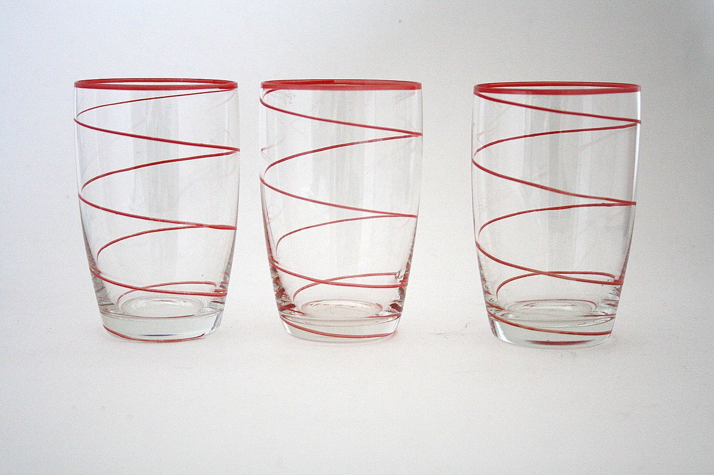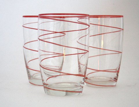Holmegaard, Ølglas med rød emaljefarvet spiral og kant, designet af Jacob E Bang. Findes også i andre farver. Produceret fra 1937 til 1957.