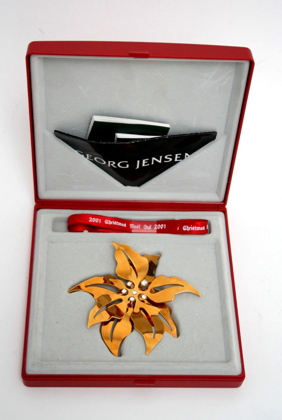 Georg Jensen, juleuro 2001 Julestjerne designet af kunstner Regitze Overgaard. Juleuroen er udført i messing belagt med 24 karat guld. Originalt rødt silkebånd og gaveæske medfølger. Pæn og velholdt stand. Pris: 450 kr. stk. Lager: 3