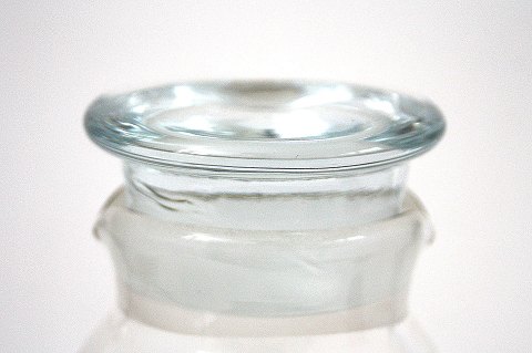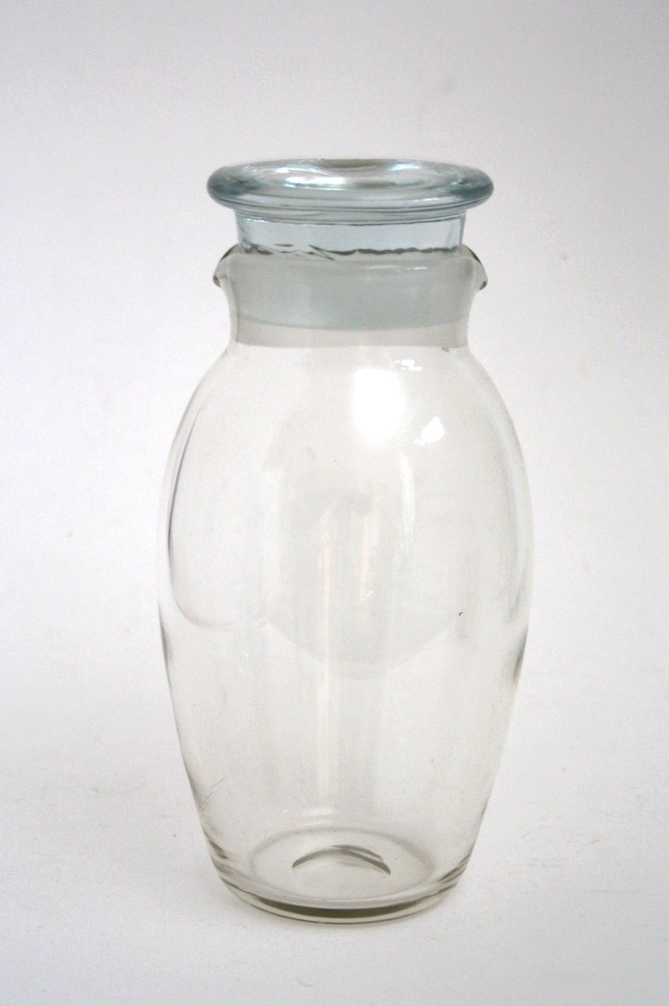 Shaker med låg. Shakeren er rundslebet i bund og har matteret slibning i toppen. Der er 2 hældetude. Højde 20 cm. Miderste diameter 10 cm. Låget er nyere med blålig tone. Pris: 250 kr.