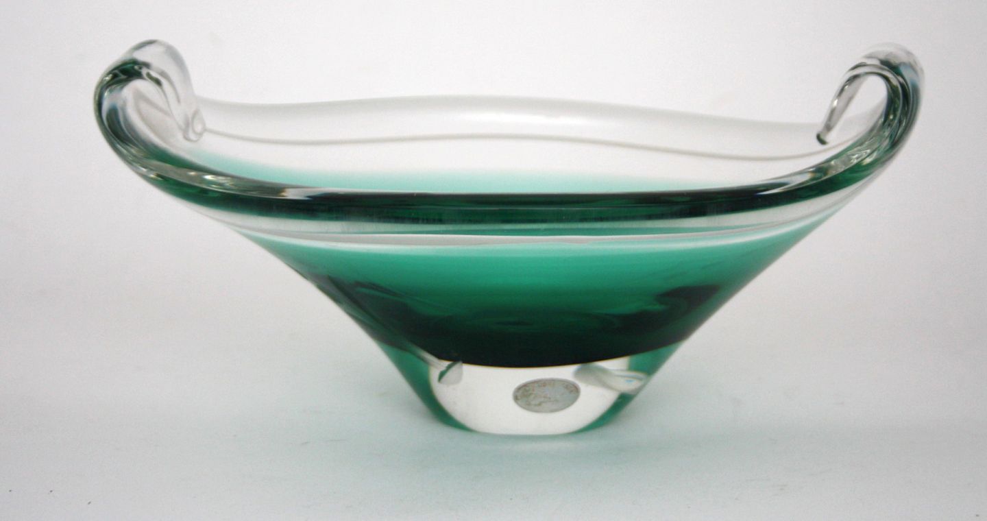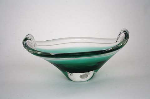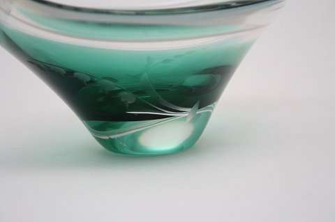 Orrefors, grøn aflang glasskål med ører. Indgraveret med liljekonvaller af glasgravør W.Johansson. Højde 11 cm. Længde 23,5 cm. Bredde 15 cm. Vægt 1280 g. Pris: 425 kr