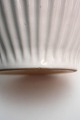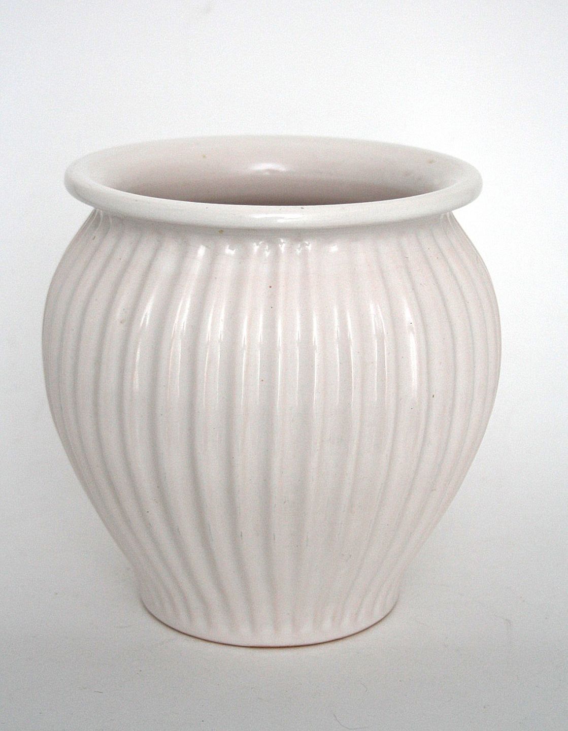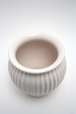 L. Hjorth, Bornholm, stor rillet vase i hvid glasur. Lille ubetydeligt afslag i bunden. Krakeleringer indvendig. Højde 18 cm. Øverste diameter 16,5 cm. Pris: SOLGT