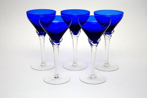 Smukke drinks glas med kongeblå kumme og snoet stilk, højde 15,5 cm. diameter 8 cm. et glas med afslag på foden se ekstra foto. Pris: SOLGT