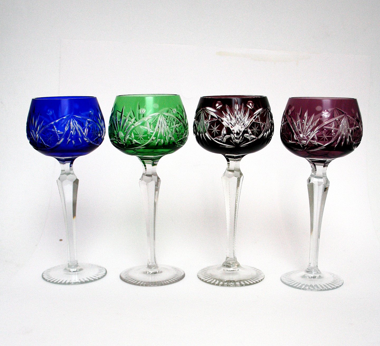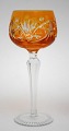Bøhmisk krystal, vinglas i flere farver. Højde 19,5 cm. Øverste diameter 6,5 cm. Pris: SOLGT Bordeaux. Lager: SOLGT Gul. Lager: 1 Rød. Lager: SOLGT Blå. Lager: 1SOLGT Grøn. Lager: SOLGT Aubergine. Lager: SOLGT Mørklilla. Lager: SOLGT
