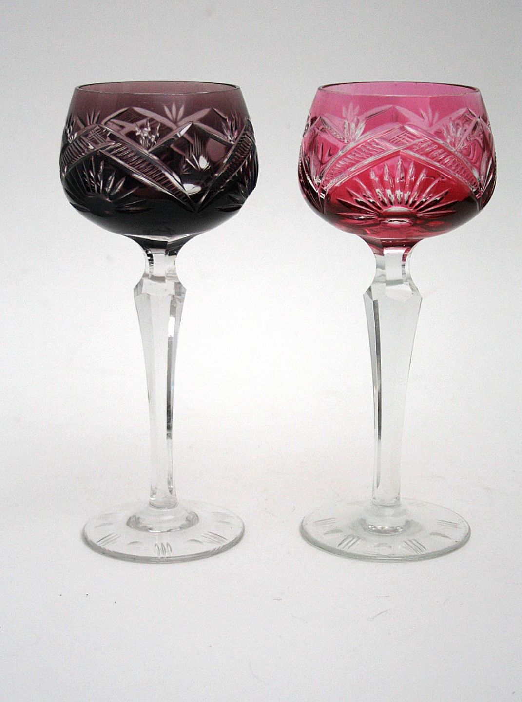 Bøhmisk krystal, vinglas. Højde 19,5 cm. Øverste diameter 6,5 cm. Bordeaux 1 stk. Rød 1 stk. Pris: SOLGT