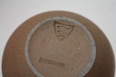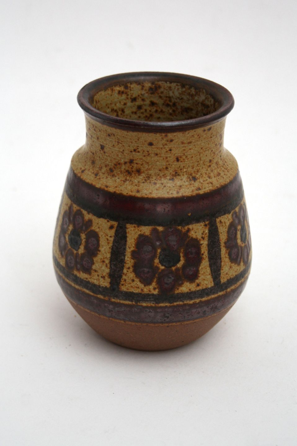 Michael Andersen, Brunglaseret vase med blomster på lysere bund. Rå brun glasur i bund. Højde 13 cm. Midterste diameter 10 cm. Pris: 300 kr.