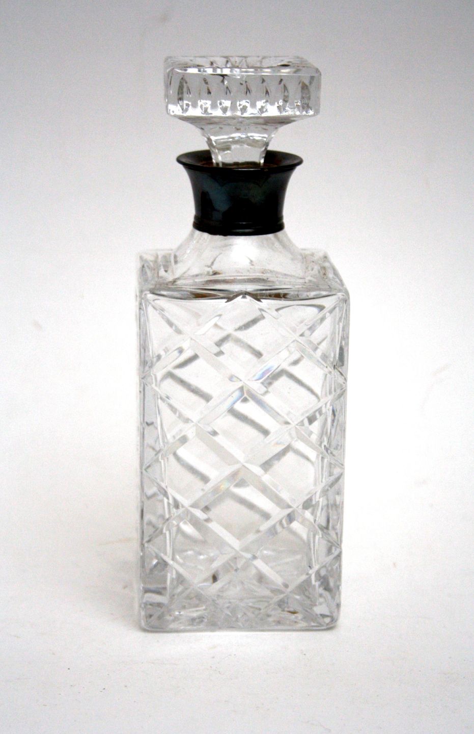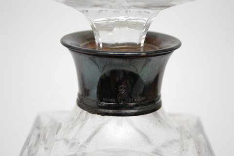 Krystalkaraffel med sølvmontering 830s Kronen Danmark. Ridser indvendig. Højde 21,5 cm. Bredde 7,5 pr side (firkantet). Pris: SOLGT