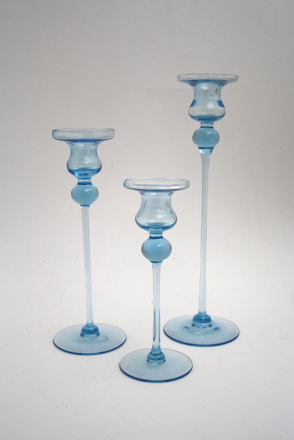 Holmegaard, Casiopeia lysestager i søblå glas, designet af Torben Jørgensen i 1984.