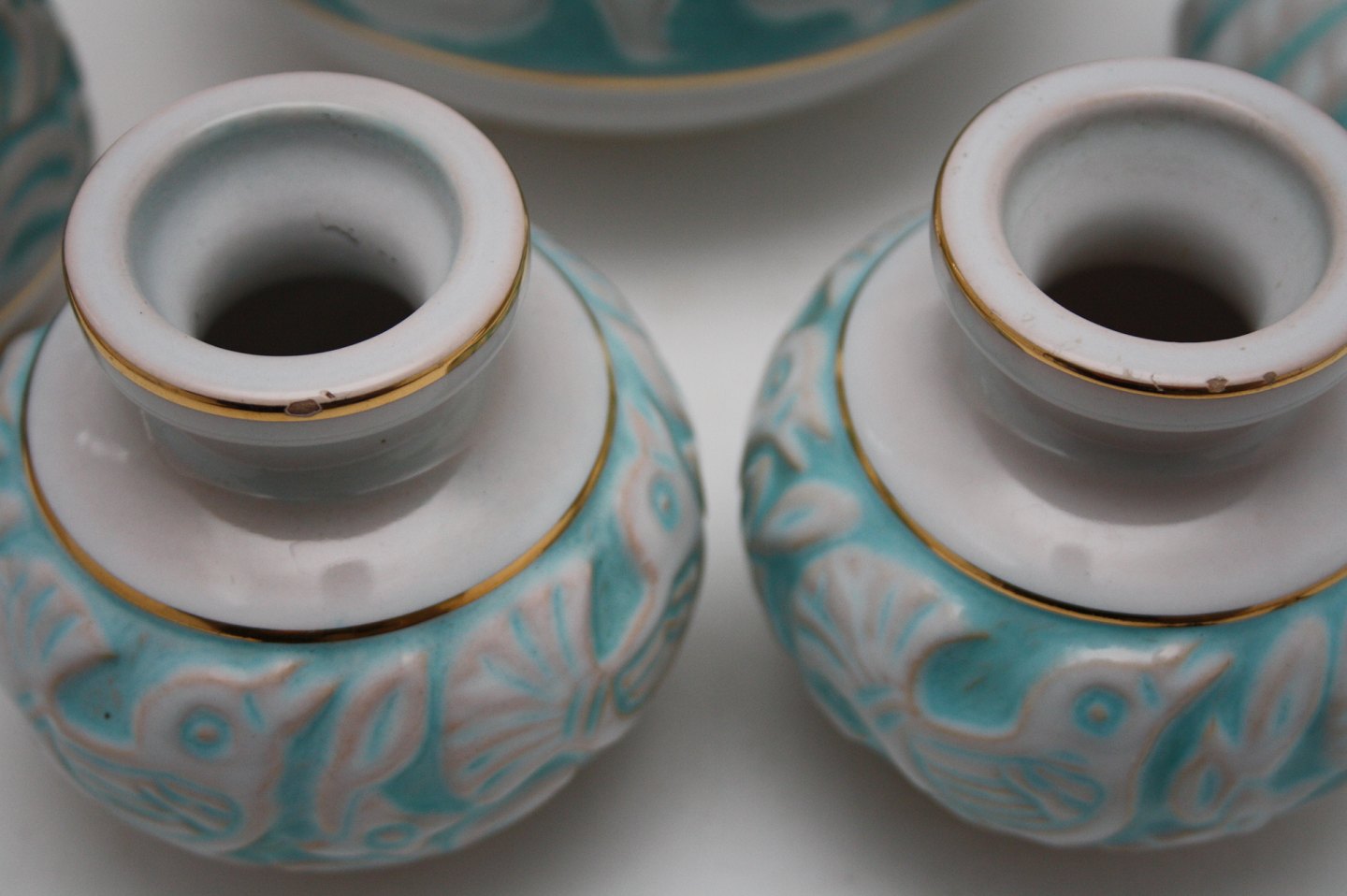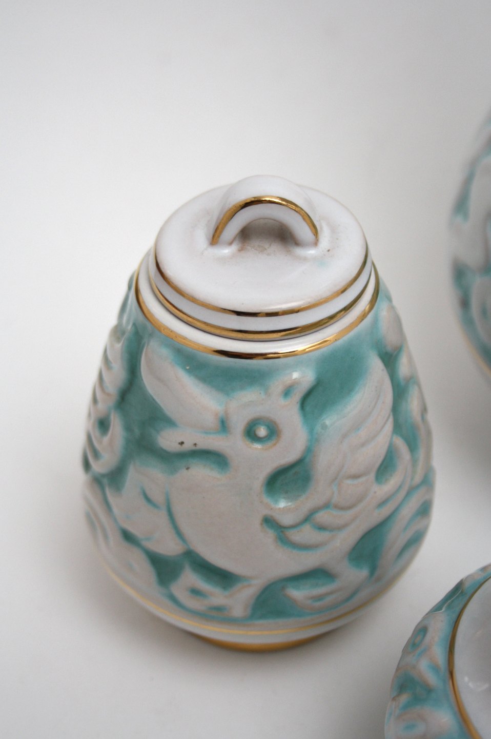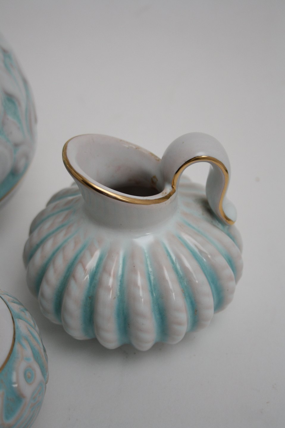 Michael Andersen & Søn. Hvid og turkisglaseret med guldkanter.