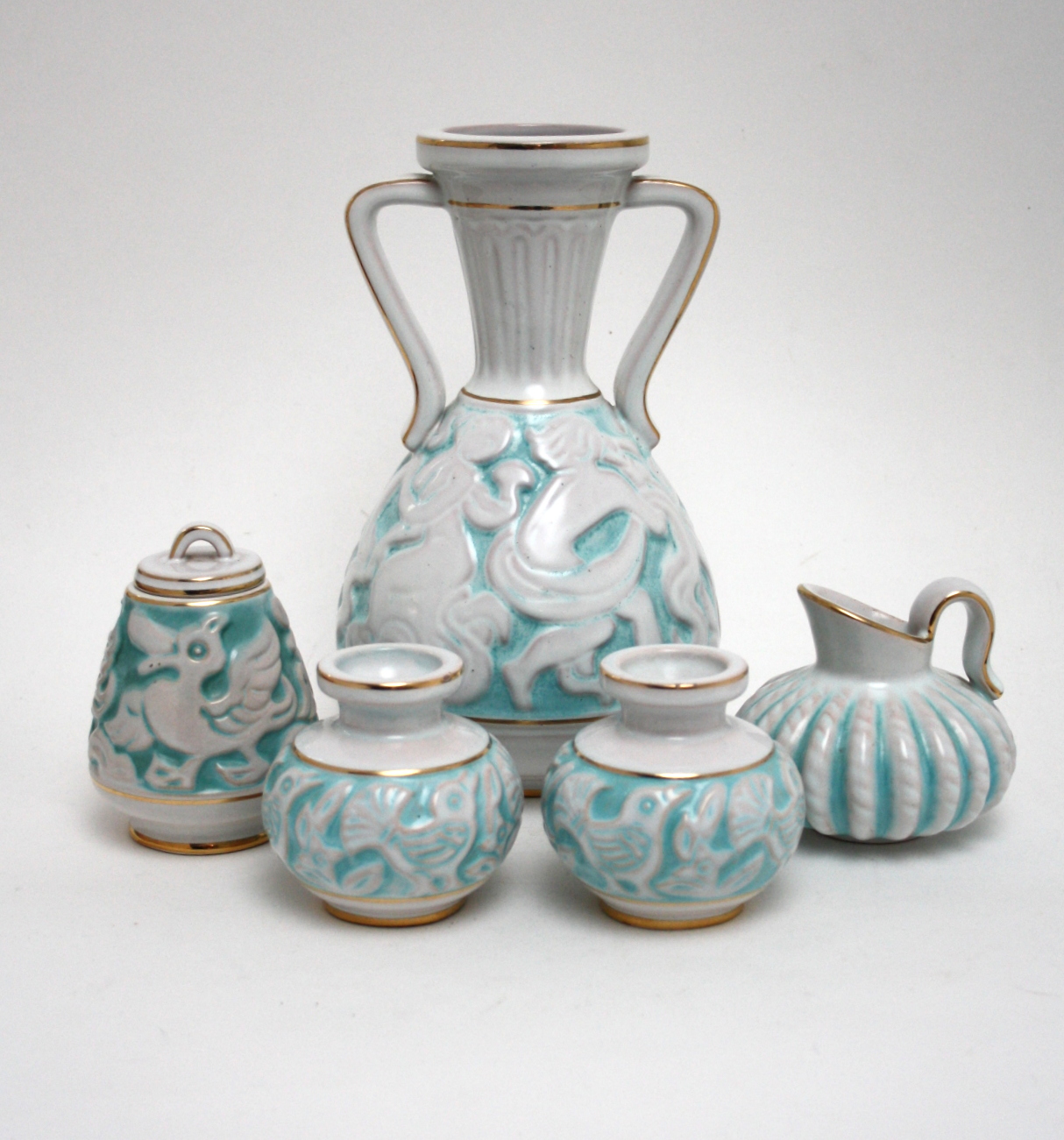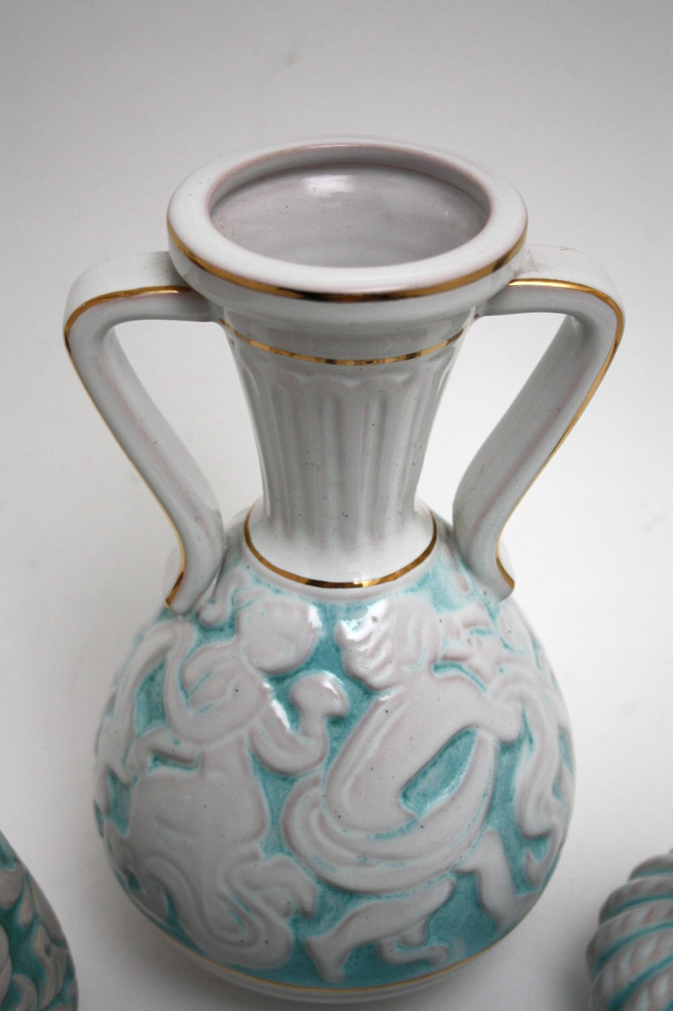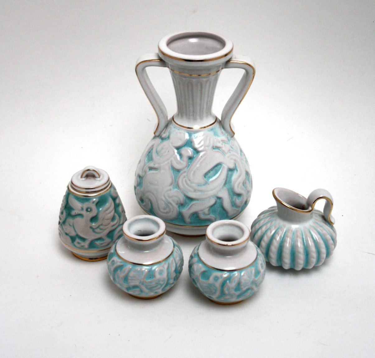 Michael Andersen & Søn. Hvid og turkisglaseret med guldkanter.
