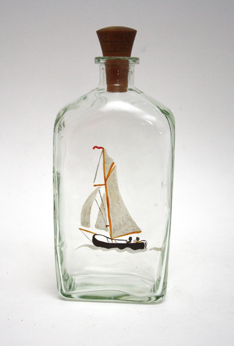 Holmegaard, kantineflaske med emalje dekoreret sejlskib og træprop. Designer Jacob Bang ca. 1937. Kantineflaske. Højde med prop 22 cm. Pris: SOLGT