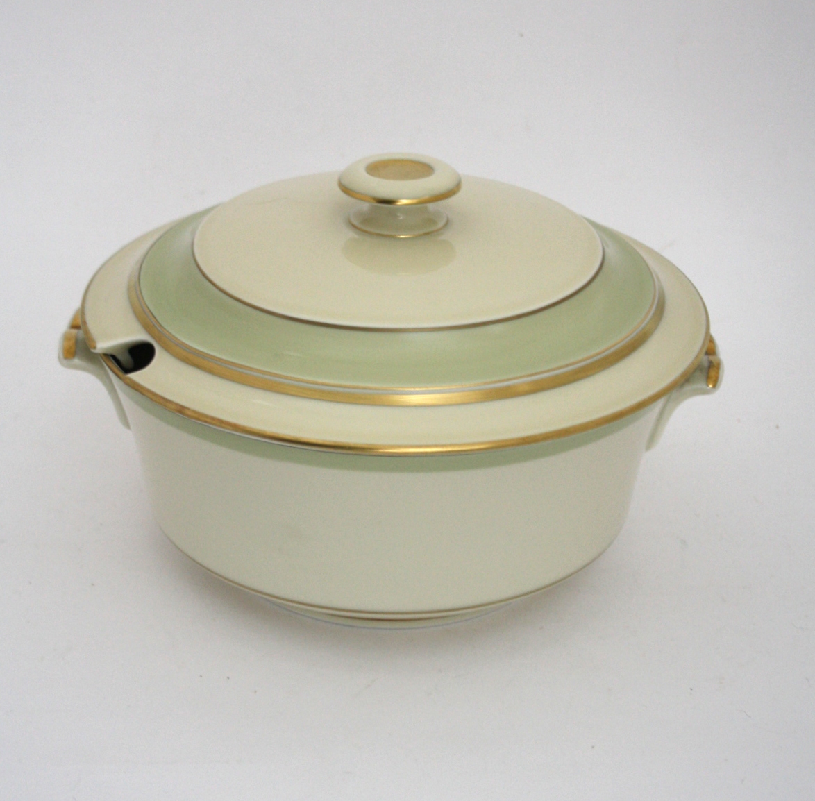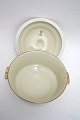 Royal Copenhagen, Broager. Cremet stel med lysegrøn bort på fane og guldkanter. Designet af Thorkild Olsen. Suppeterrin med låg med hul til ske. Nr. 1236/9576. Højde 18 cm. Diameter 24 cm. Længde 27 cm. I. og II. sortering. Pris: 750 kr. stk. Lager: 2
