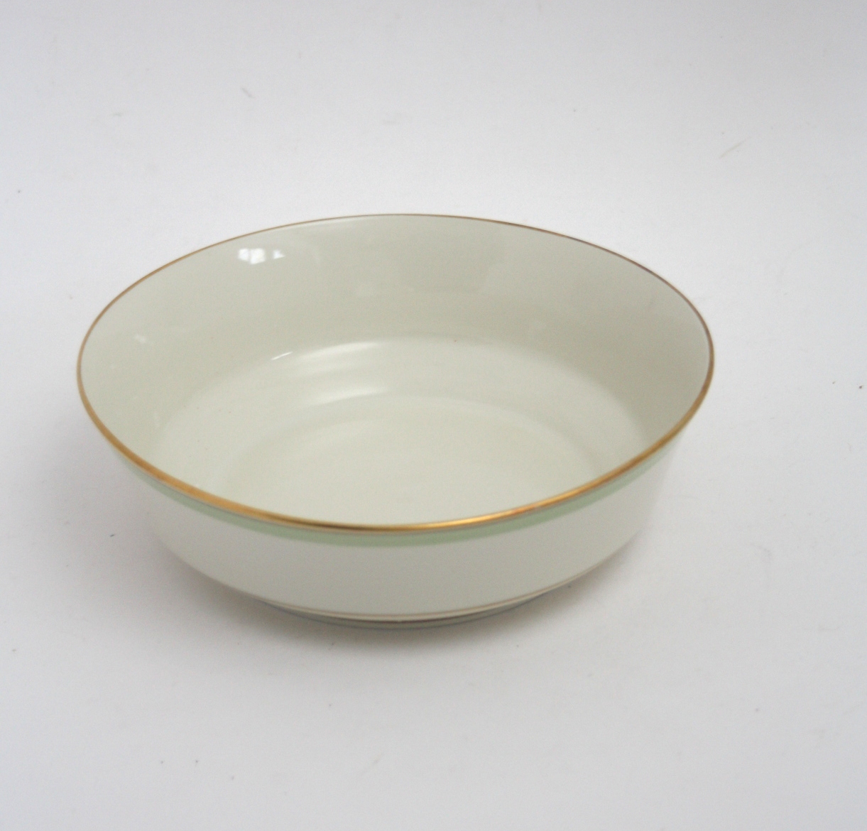 Royal Copenhagen, Broager. Cremet stel med lysegrøn bort og guldkanter. Designet af Thorkild Olsen. Kartoffelskål. Højde 6,5 cm. Diameter 21 cm. Nr. 1236/9593. I. og II. sortering. Pris: 250 kr. stk. Lager: 2