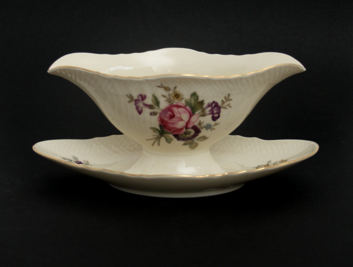 Royal Copenhagen, Frisenborg svejfet stel creme med forskellige blomstermotiver og guldkant. Sovseskål på fast tallerken. Nr. 910/1871. Længde 24,5 cm. Bredde 12 cm. Højde 11 cm. I sortering. Almindeligt let brugsslid på guldkanter. Pris: 375 kr. stk. Lager: 1