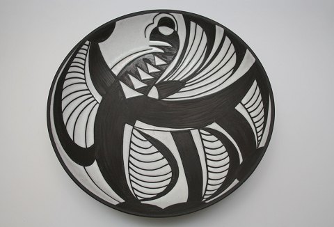 Karaffel med hvid emaljebemalet vinranke. Sorte pletter i bemalingen. Knækket i bund. Højde 23,5 cm. Pris: SOLGT