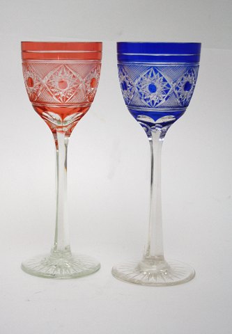 Bøhmisk krystal, vinglas med slibninger på kumme og sleben stilk. Højde 20,50 cm. Pris: 250 kr. stk. Grøn. Lager: SOLGT Rød. Lager: SOLGT