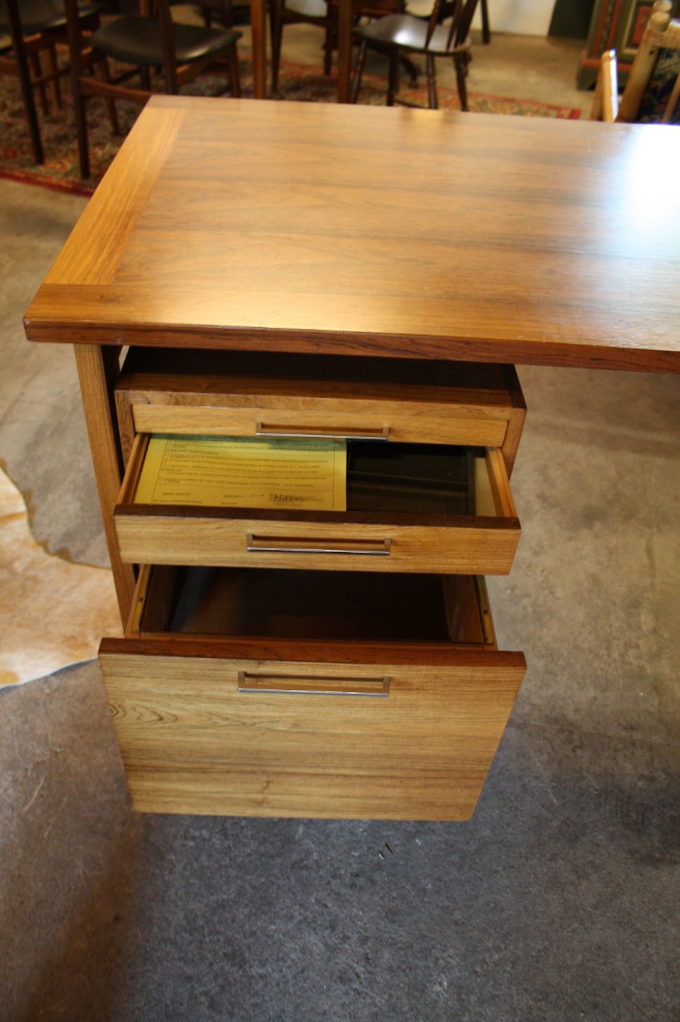 Poul Cadovius, palisander skrivebord i flot stand. 3 skuffer, den nederste er til arkivmapper. Certifikat medfølger. Højde 70,5 cm. Bredde 72 cm. Længde 155 cm. Pris: SOLGT