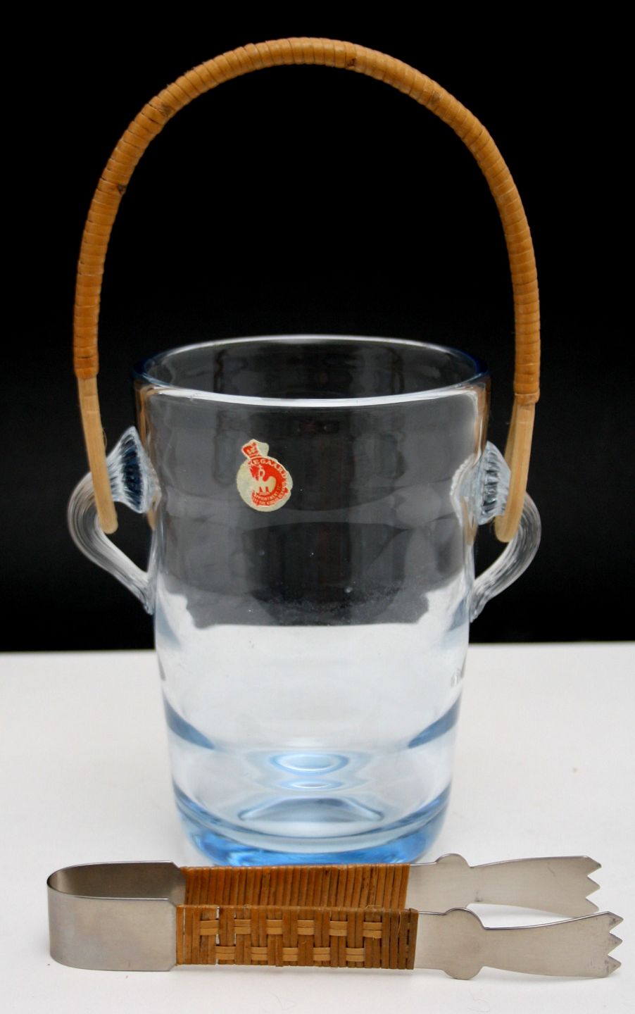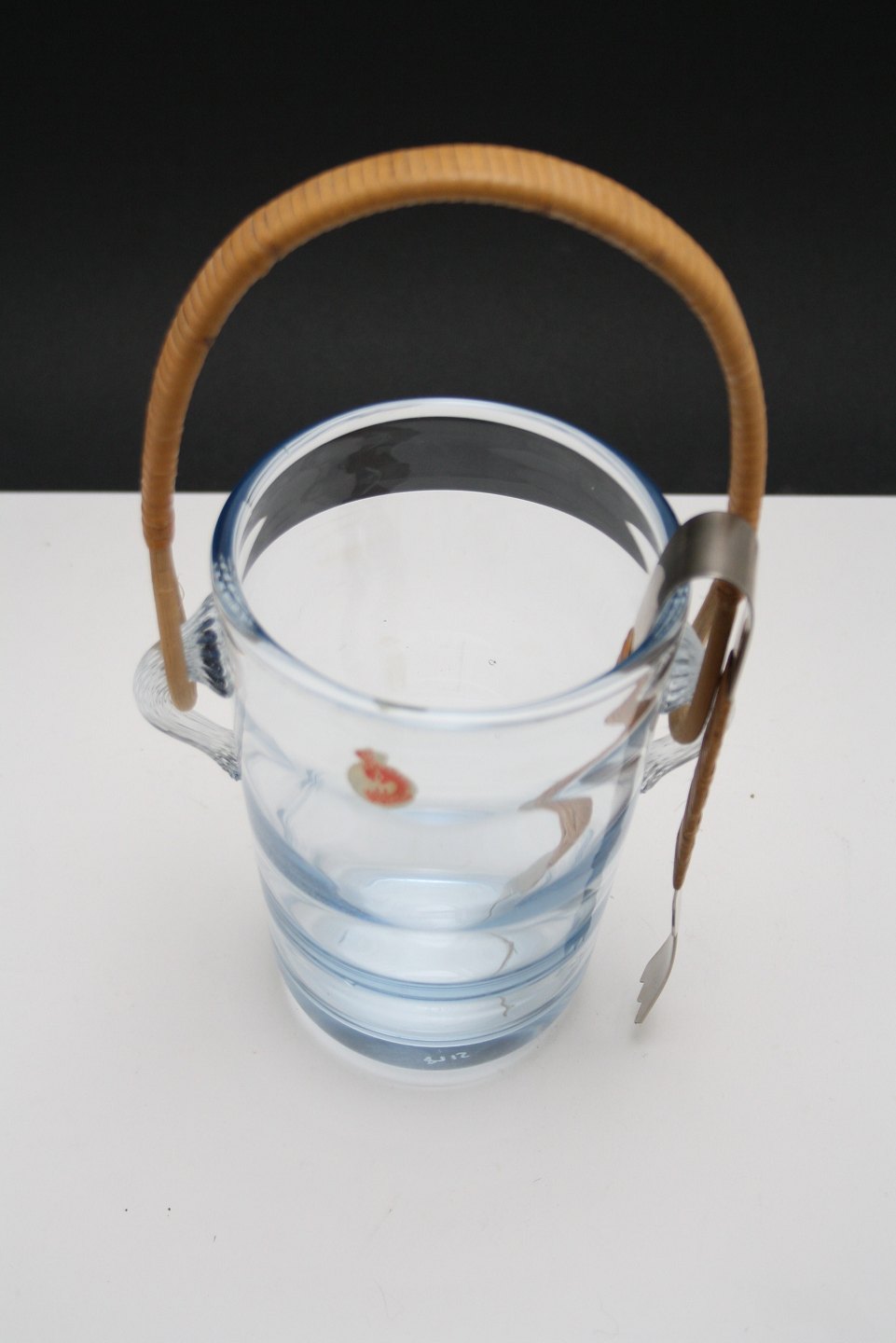 Holmegaard, Isspand i akva serien med basthank og istang. Designet af Per Lütken i 1953. Der er 3 forskellige istænger. 1 med brunt bast som billedet, 1 med træskaft og 1 blank.