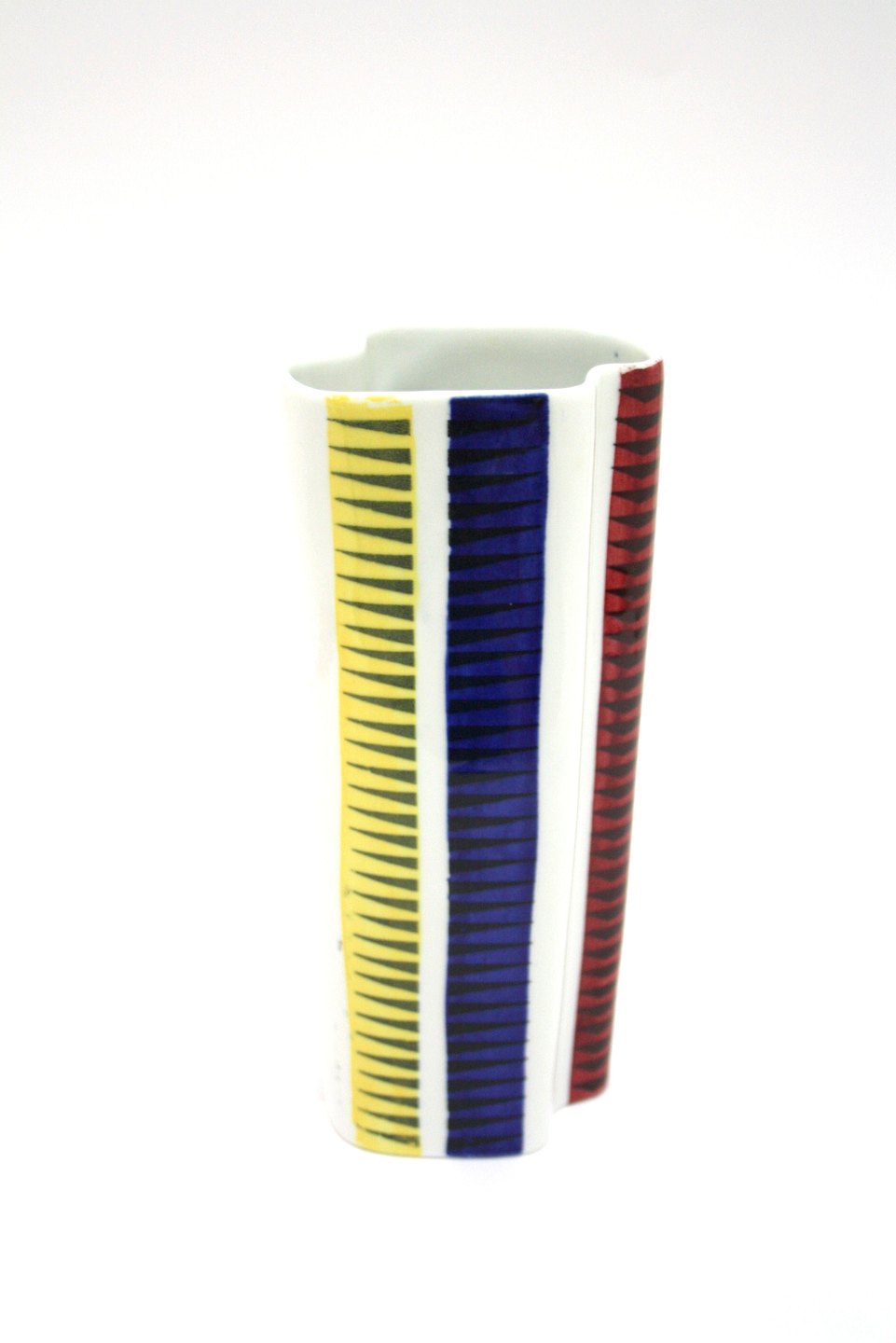 Linköbings porcelænsfabrik ALP overgår til Rørstrand i 1932, ALP stemplet bruges frem til 1943. Kaskad vase i hvid, gul, rød og blå. Højde 21 cm. Flot stand. Pris: SOLGT