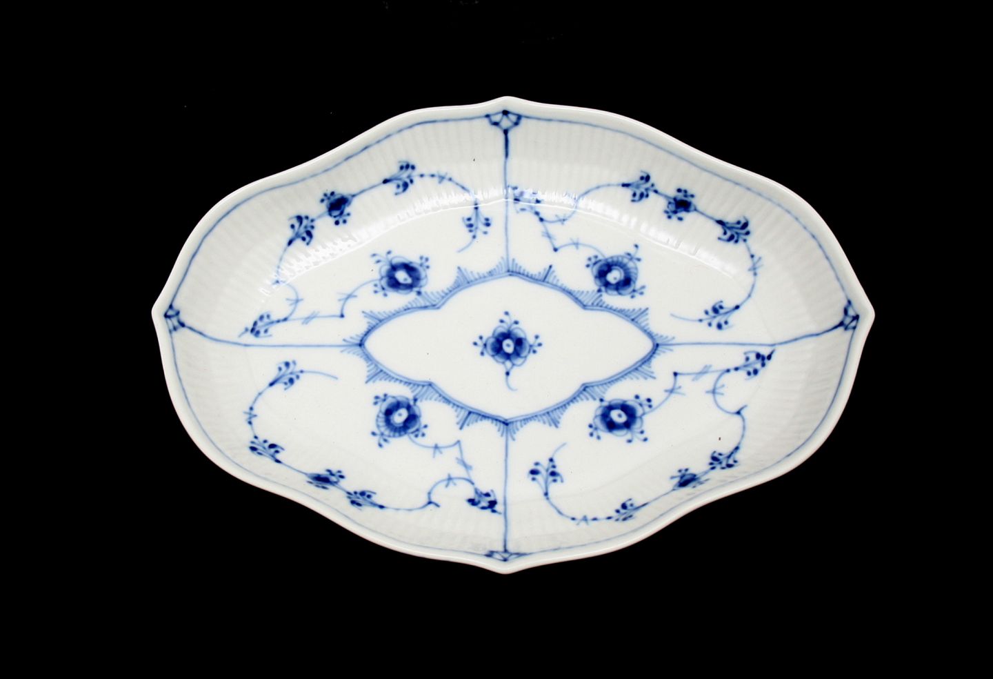 Royal Copenhagen, Musselmalet riflet Kagefad. Formnr. 1/147. II. sortering. Længde 22,5 cm. Bredde 16 cm. Højde 3,5 cm. Flot stand fejlfri. Pris: SOLGT
