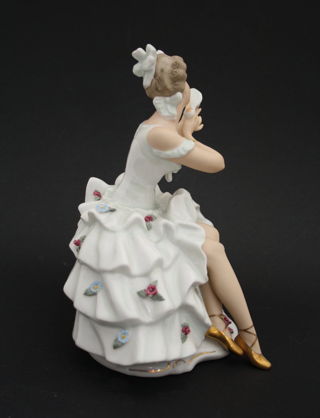 Wallendorf, Germany, Ballerina der sminker sig. Mærket W 1764 Germany. Kjole er glasseret, krop og hoved uglasseret. Påsatte blomster på kjolen. Højde 20,5 cm. Flot stand. Pris: SOLGT