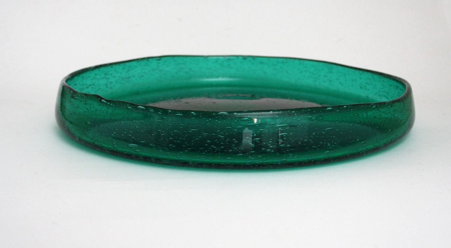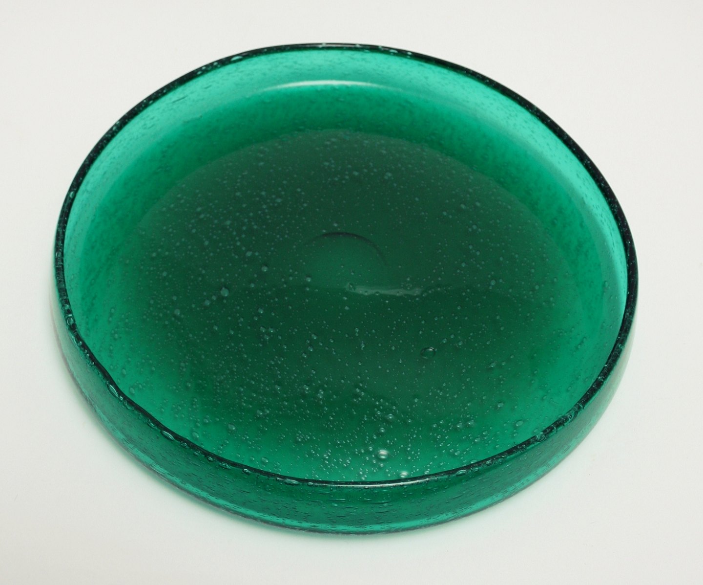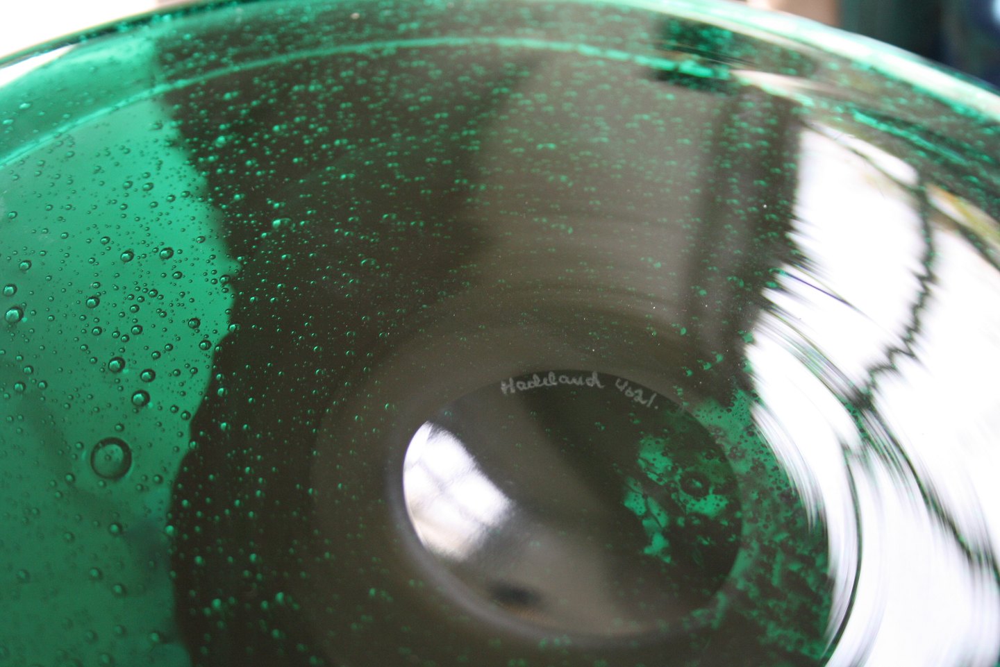 Hadeland Norway stort grønt glasfad i serien Grønland, designet af Arne Jon Jutrem i 1950'erne. Signeret Hadeland 4021. Diameter 32 cm. Højde 4,5. 2 luftbobler er bristet, kan mærkes og ses på overfladen i selve fadet, ellers i flot stand. Pris: SOLGT