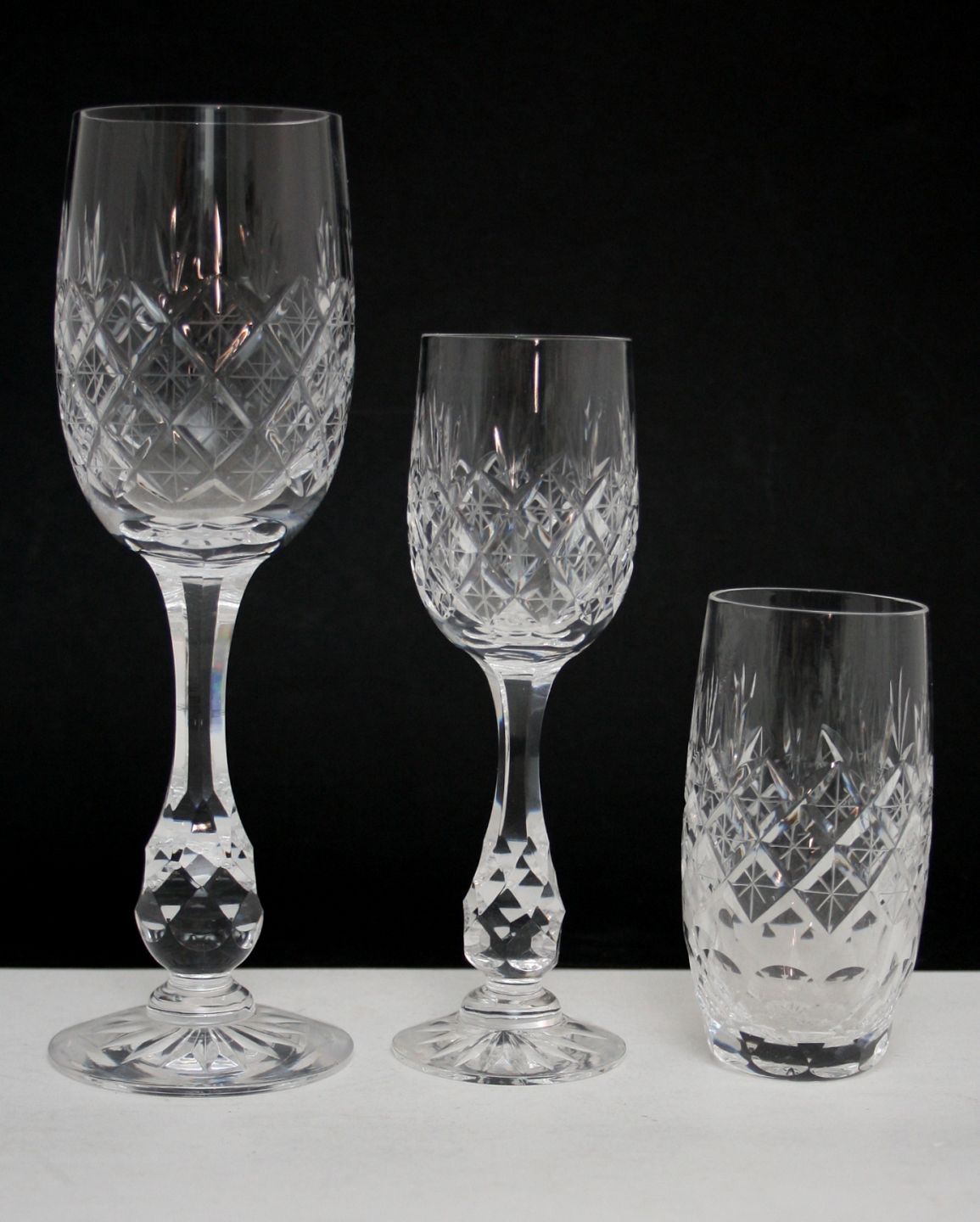 Kosta Boda, Pompadour krystalglas. Antiksleben kumme og stilk med knop. Vinglas. Højde 19,5 cm. Pris: Portvin. Højde 15,5 cm. Pris: Vandglas. Højde 10 cm. Pris: Kan sælges samlet for