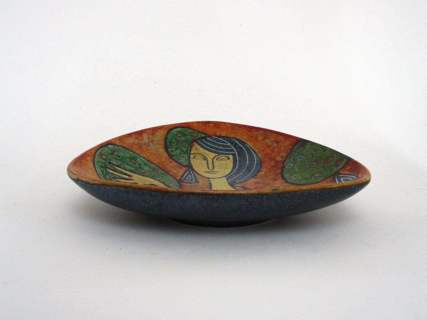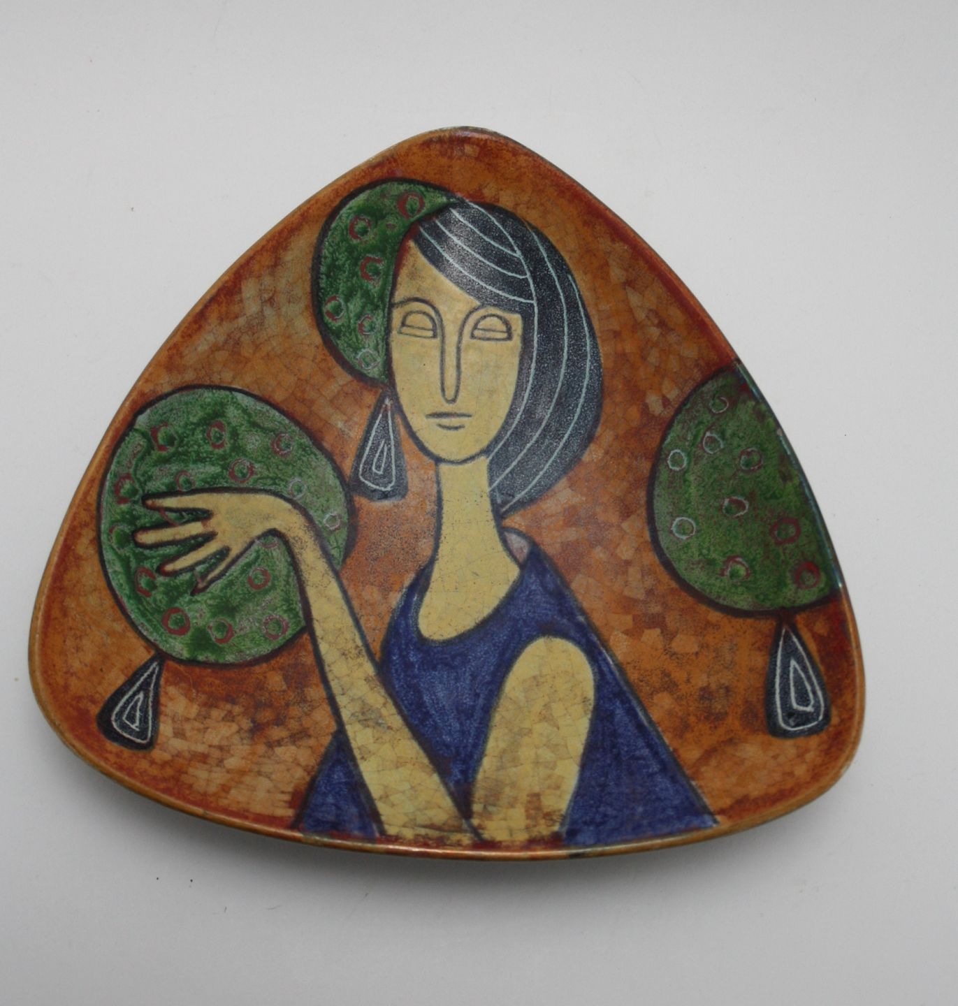 Michael Andersen, Bornholm, Trekantet fad med kvinde i krakelé glasur. 25 x 25 cm. Højde 5 cm. Formnr 5550. Fadet er i perfekt stand, bortset fra lille glasurafslag på højre side. Pris: SOLGT