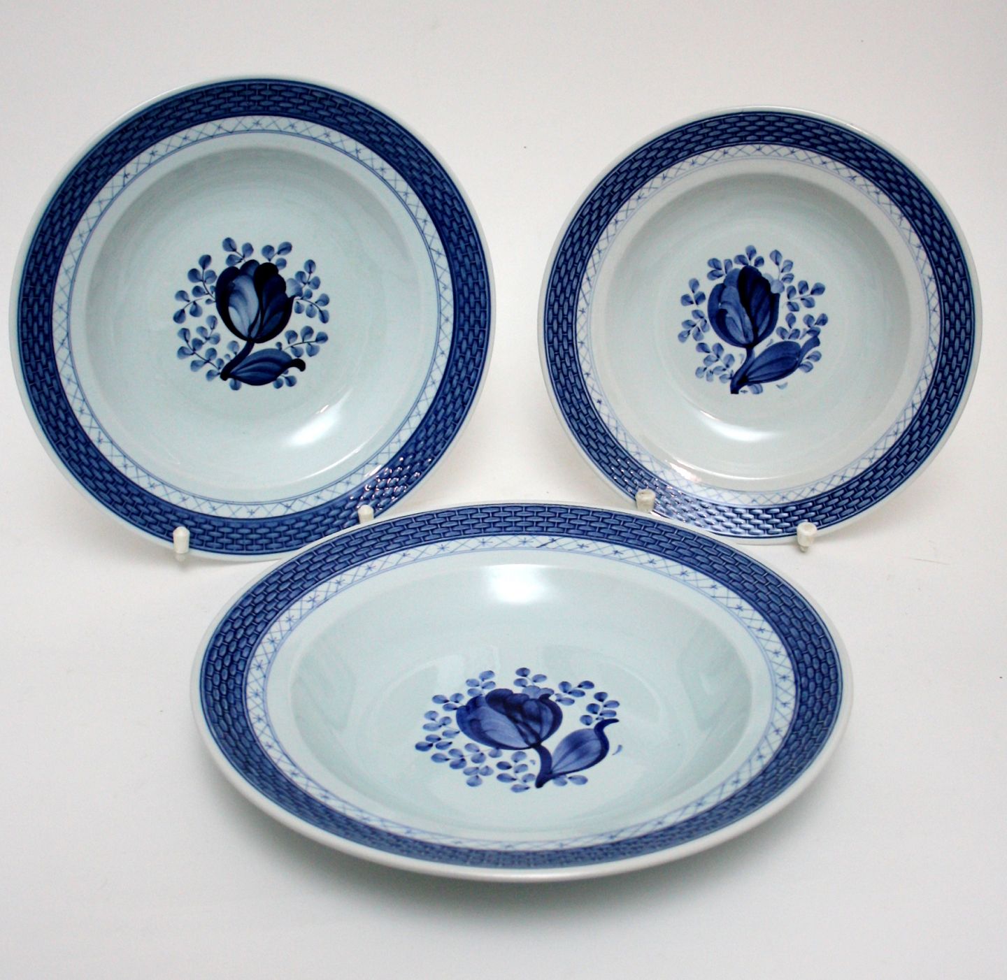 Aluminia, Tranquebar lyseblå fajance med mørkeblå tulipan og flettet bort designet af Christian Joachim. Produceret fra 1914 til 1969, hvor det overgik til Royal Copenhagen. Håndmalet. Flot stand. Enkelte med lettere overfladekrakelering.