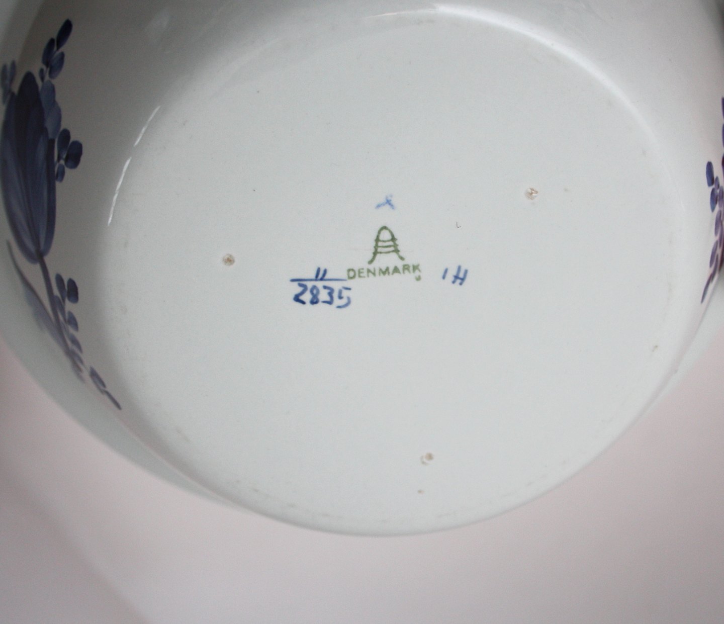 Aluminia, Ny Tranquebar lyseblå fajance med mørkeblå tulipan, ny form uden flettet bort. Håndmalet. Produceret fra 1959 til 1969. Rundt fad. Dekorationsnr. 11/2835. Diameter 23 cm. Højde 7 cm. Perfekt stand. Pris: solgt