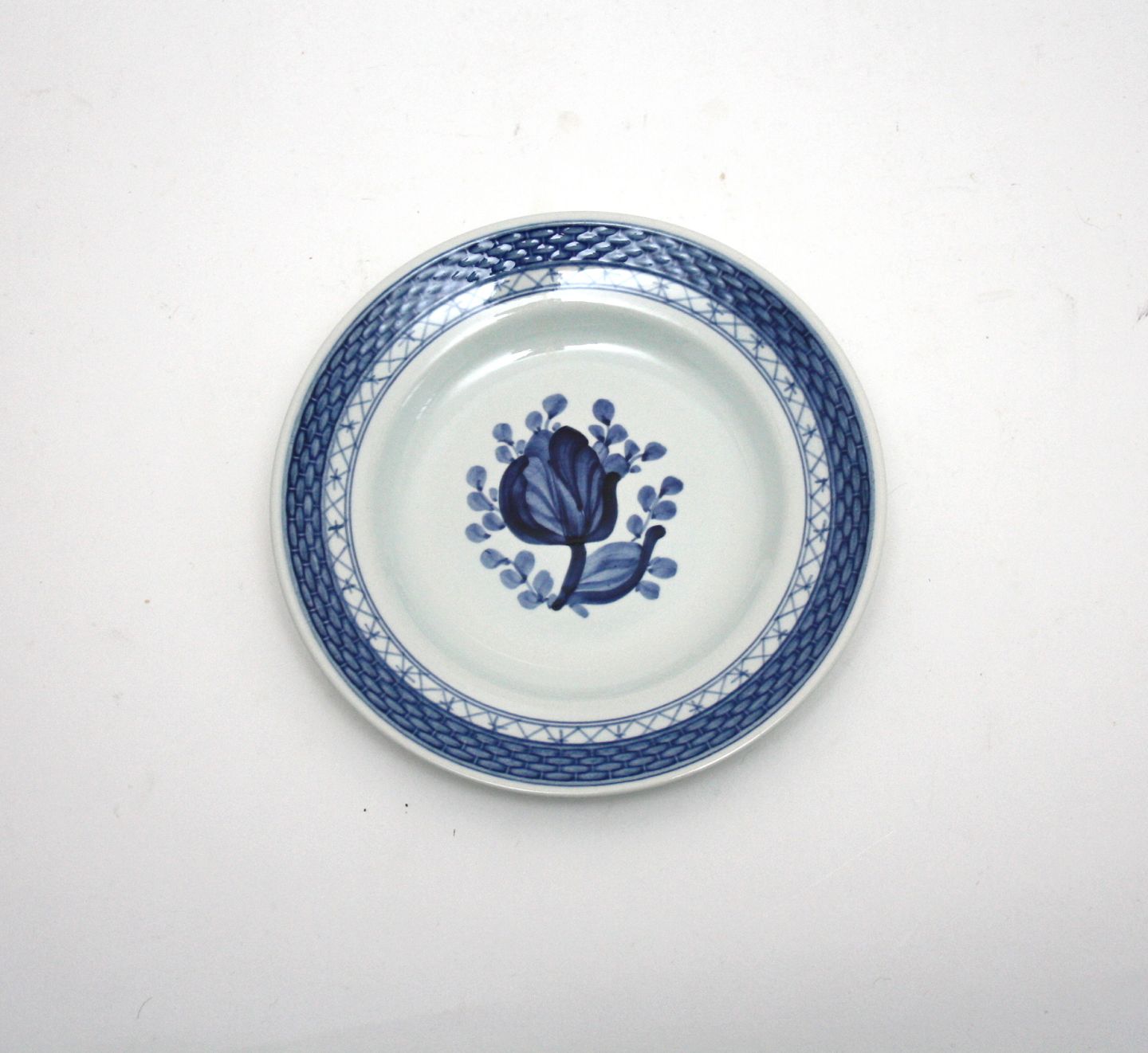 Aluminia, Tranquebar lyseblå fajance med mørkeblå tulipan og flettet bort designet af Christian Joachim. Produceret fra 1914 til 1969, hvor det overgik til Royal Copenhagen. Håndmalet. Flot stand.
