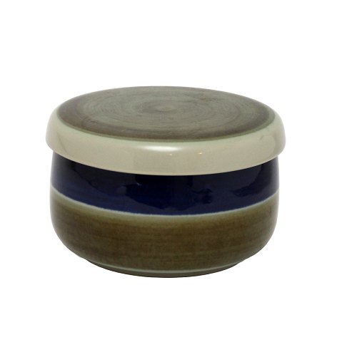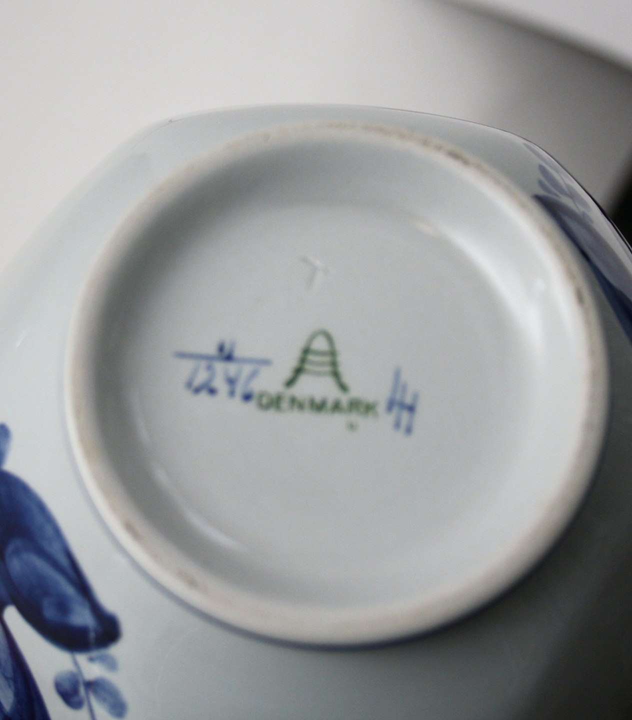 Aluminia, Tranquebar lyseblå fajance med mørkeblå tulipan og flettet bort designet af Christian Joachim. Produceret fra 1914 til 1969, hvor det overgik til Royal Copenhagen. Håndmalet. Flot stand.
