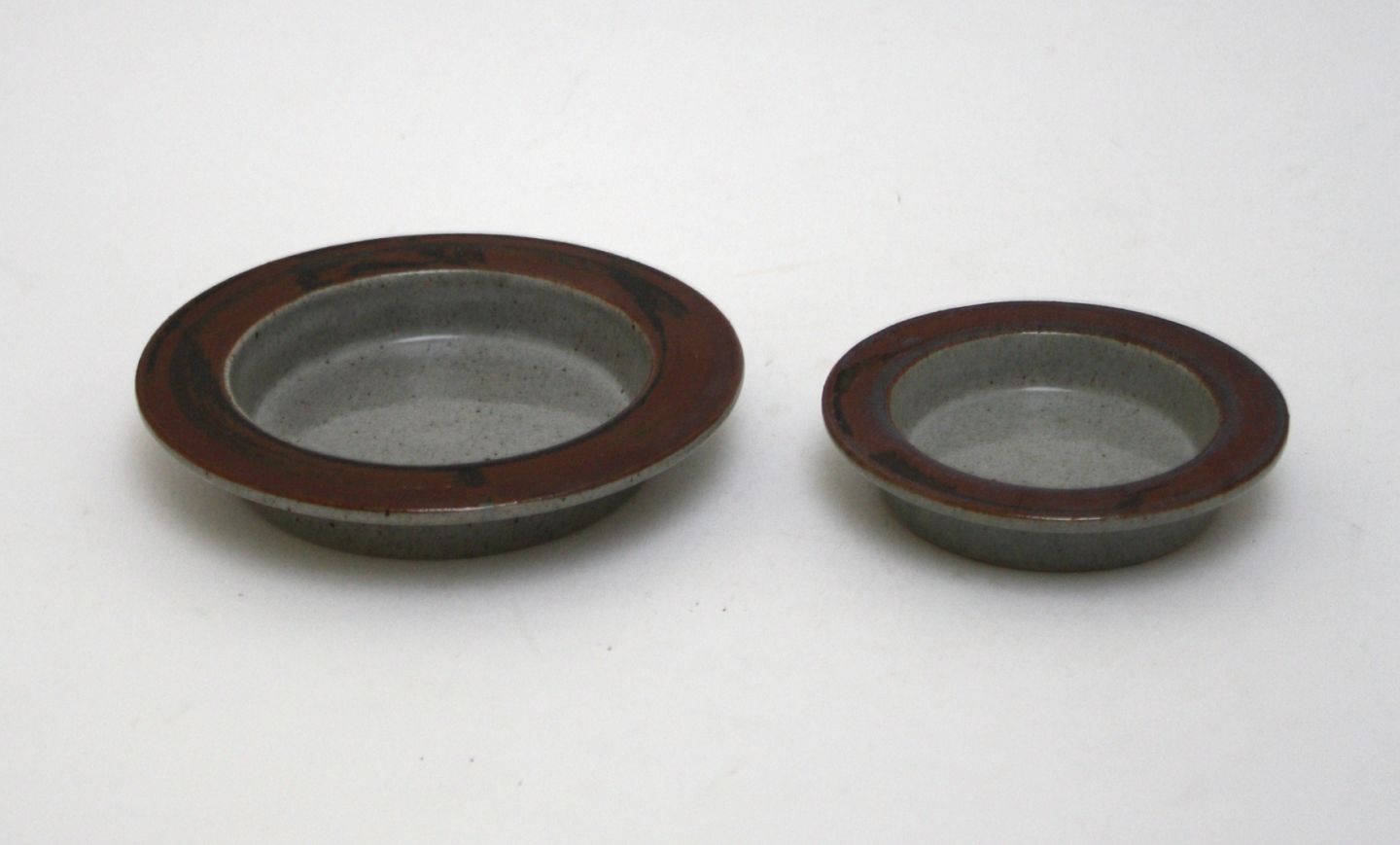 Askebæger/flaskebakke. Højde 2,5 cm. Diameter 14,5 cm. Pris: 60 kr. stk. Lager: 1