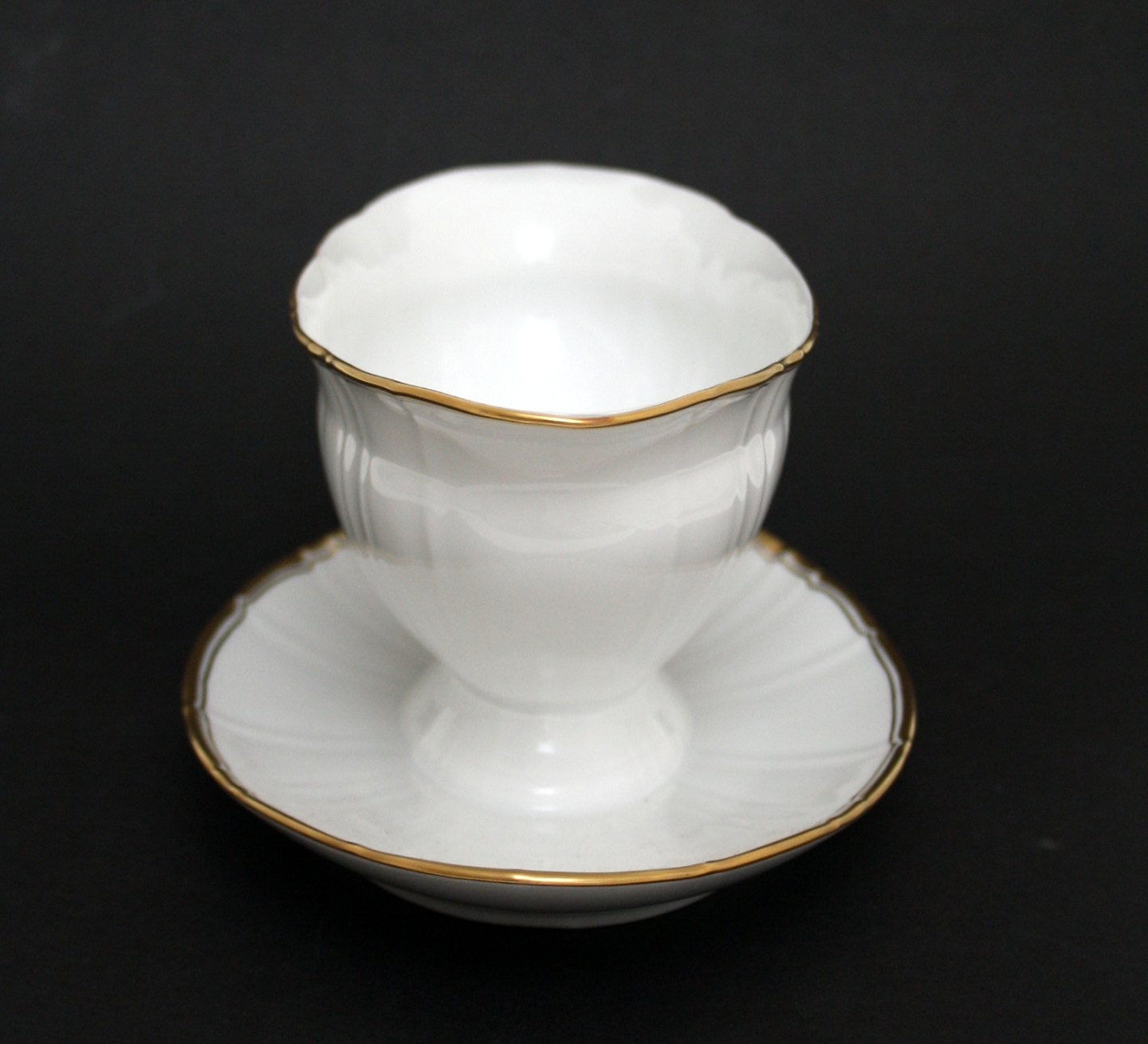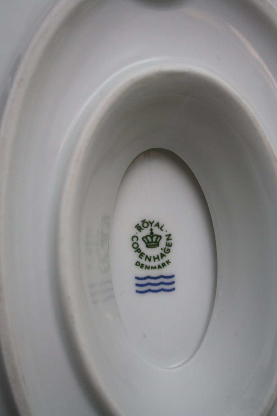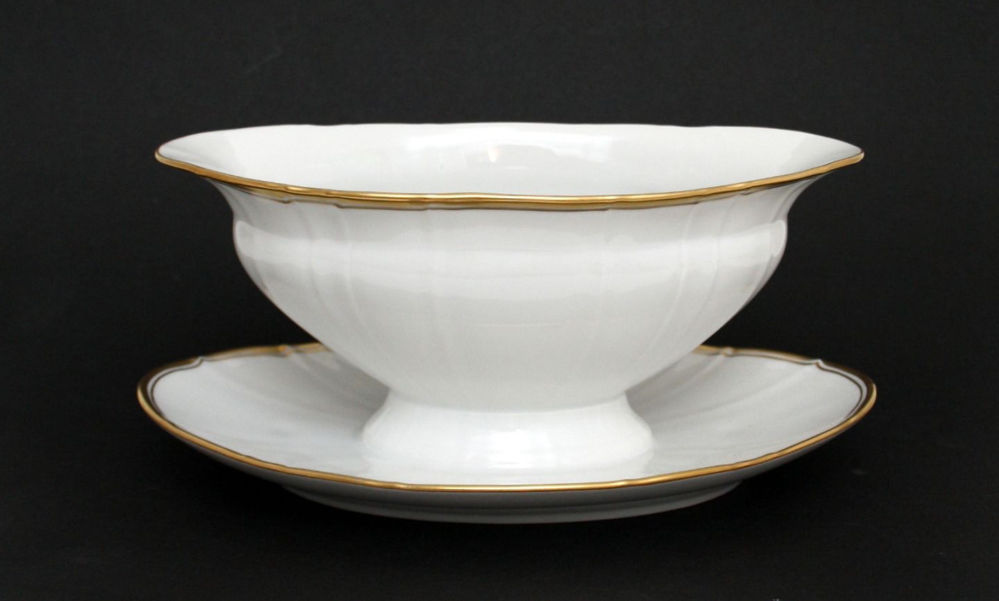 Royal Copenhagen, (normalt B&G) Offenbach, hvidt porcelæn med knækkede kanter og guld. Sovseskål. Højde 11 cm. Længde 24 cm. Bredde 15 cm. I. sortering. Pris: 650 kr. stk. Lager: 2