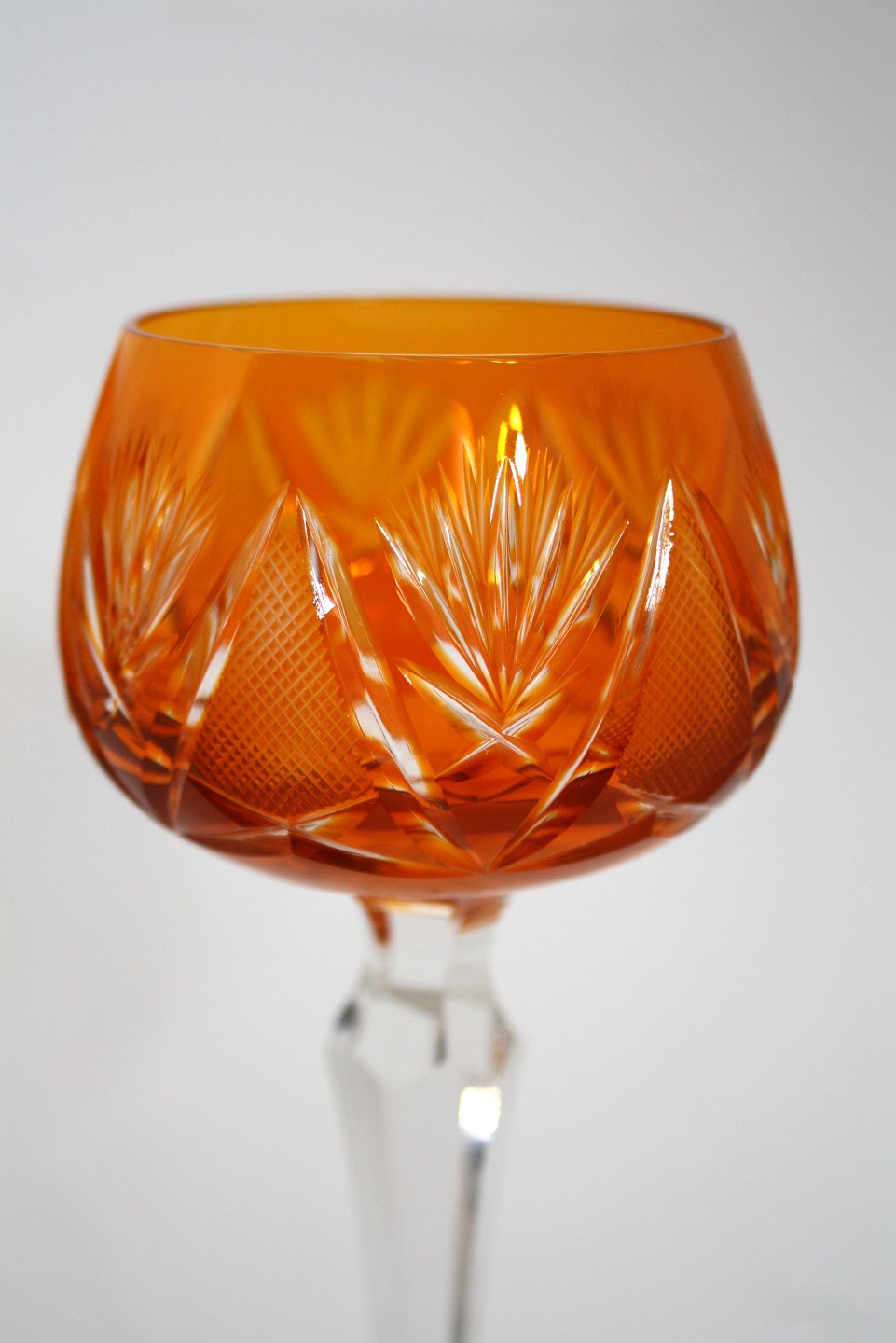 Bøhmisk krystal, Orange vinglas med slibninger på kumme og stilk. Højde 19,5 cm. Pris: SOLGT