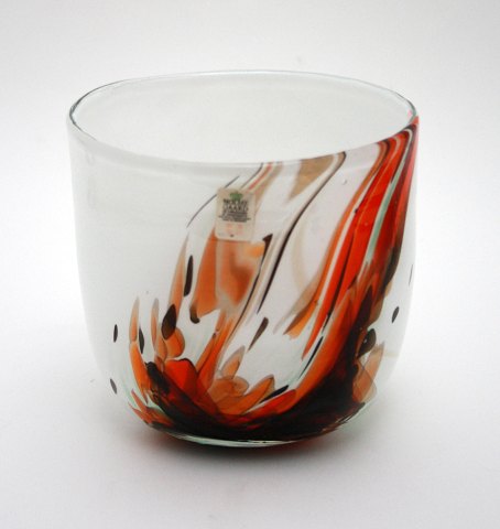 Holmegaard, Cascade vase designet af Per Lütken i 1970,erne. Mundblæst opalhvid glas med indlagte skår i lys brun og sart lilla farver. Signeret HG7. Højde 15 cm. Diameter 9,5 cm. Pris: 450 kr.